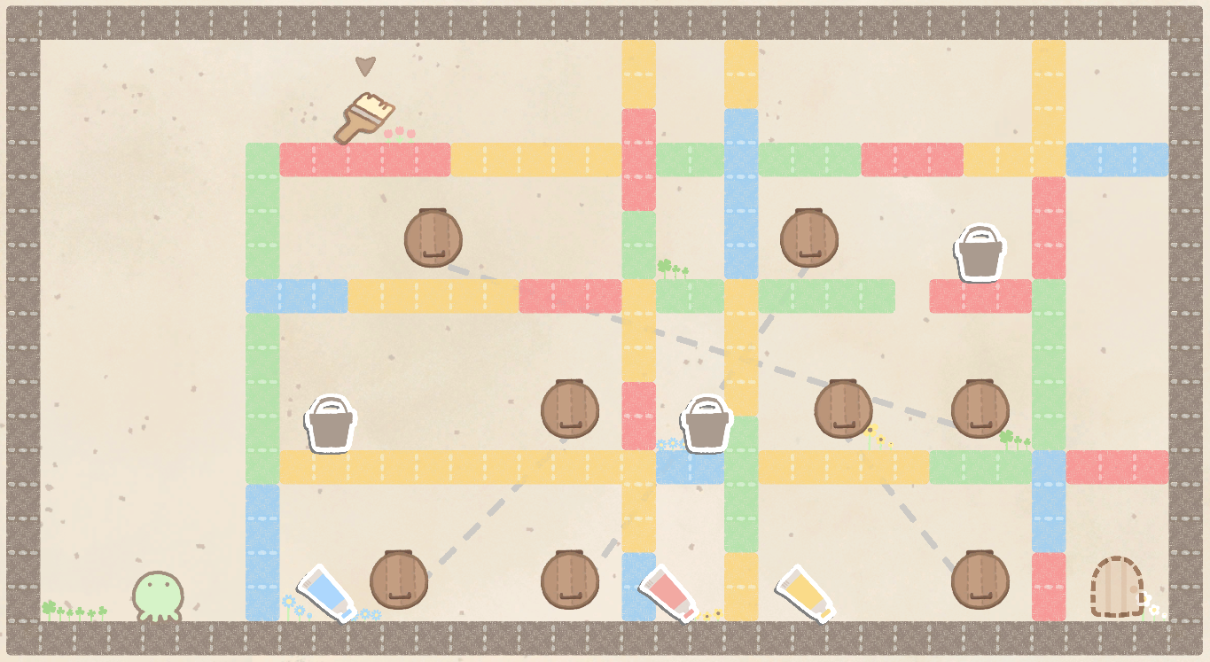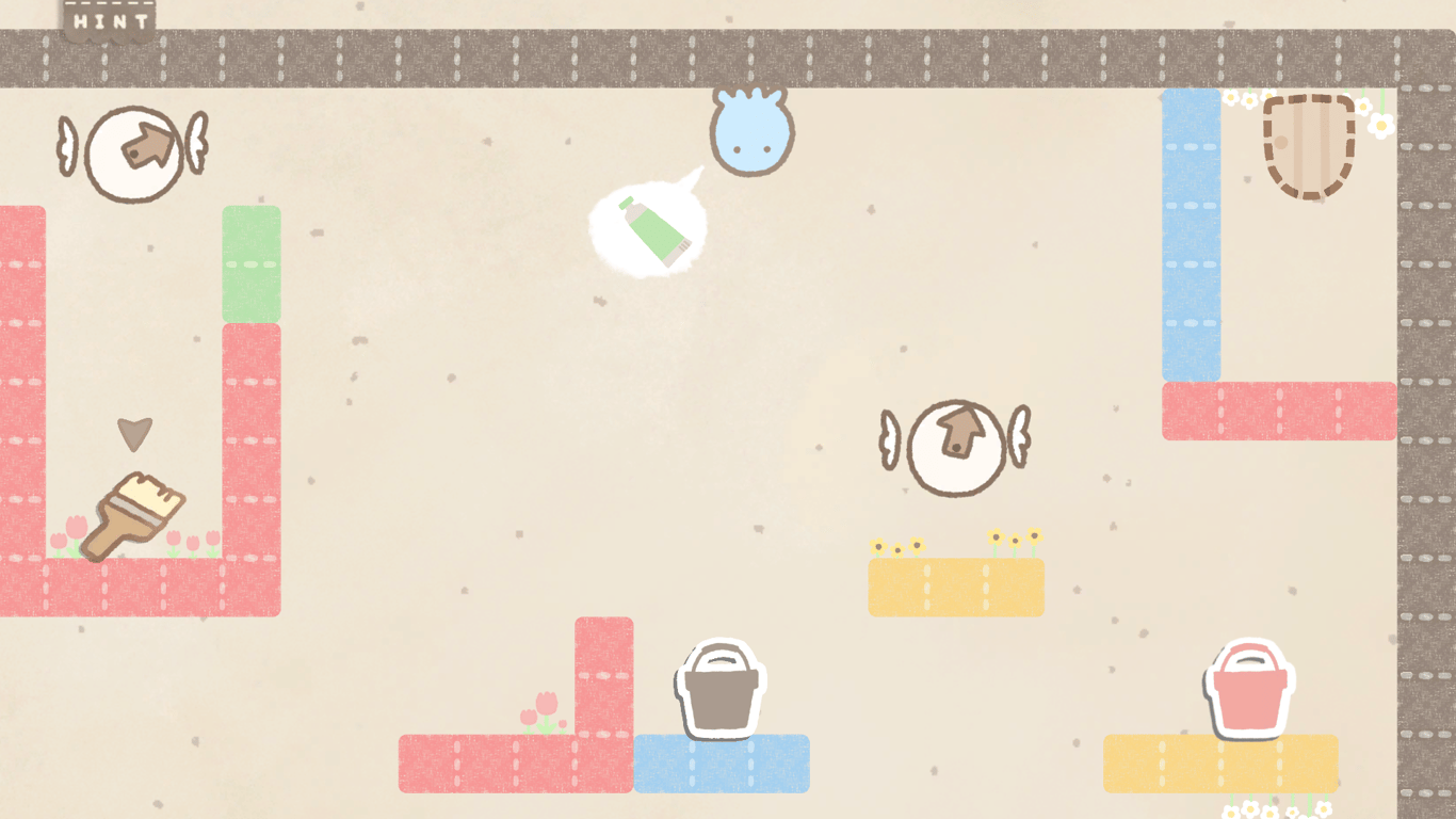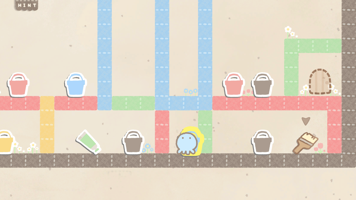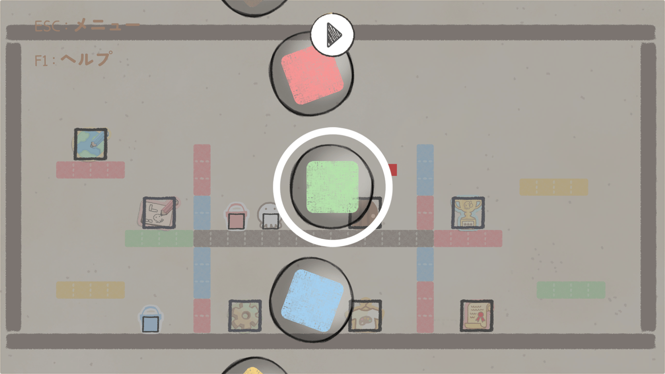拾った「絵の具」をバケツに入れるとムーニーの色が変わる。どの色のブロックを通り抜けるか、どの絵の具をどのバケツに入れるかを考えて、ステージを突破しよう。