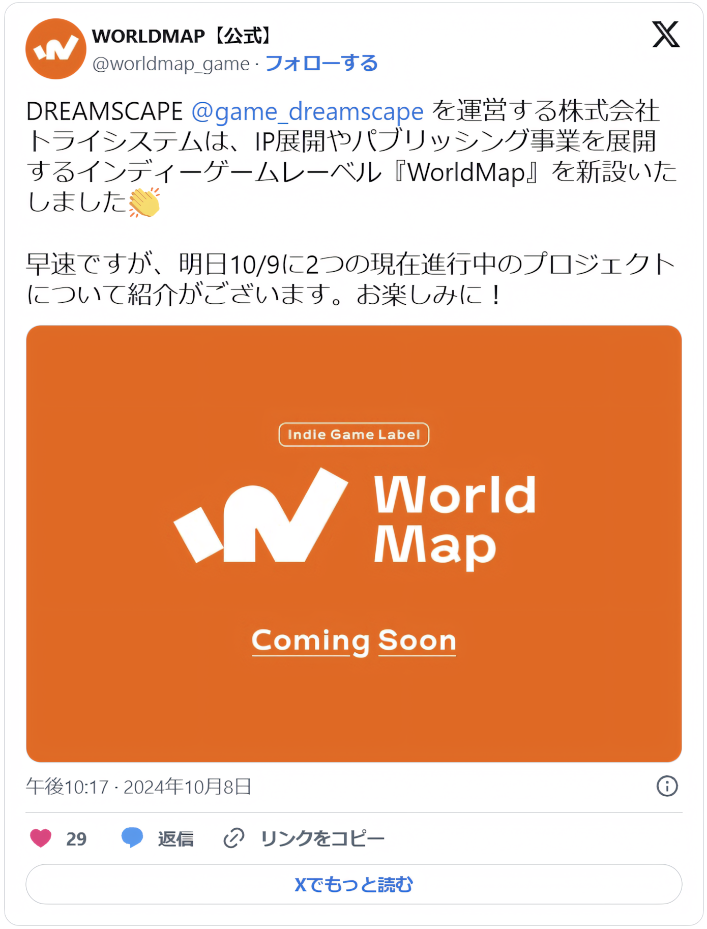 2024年10月8日、株式会社トライシステムはIP展開やパブリッシング事業を展開するインディーゲームレーベル「WorldMap」を設立したことを発表した。