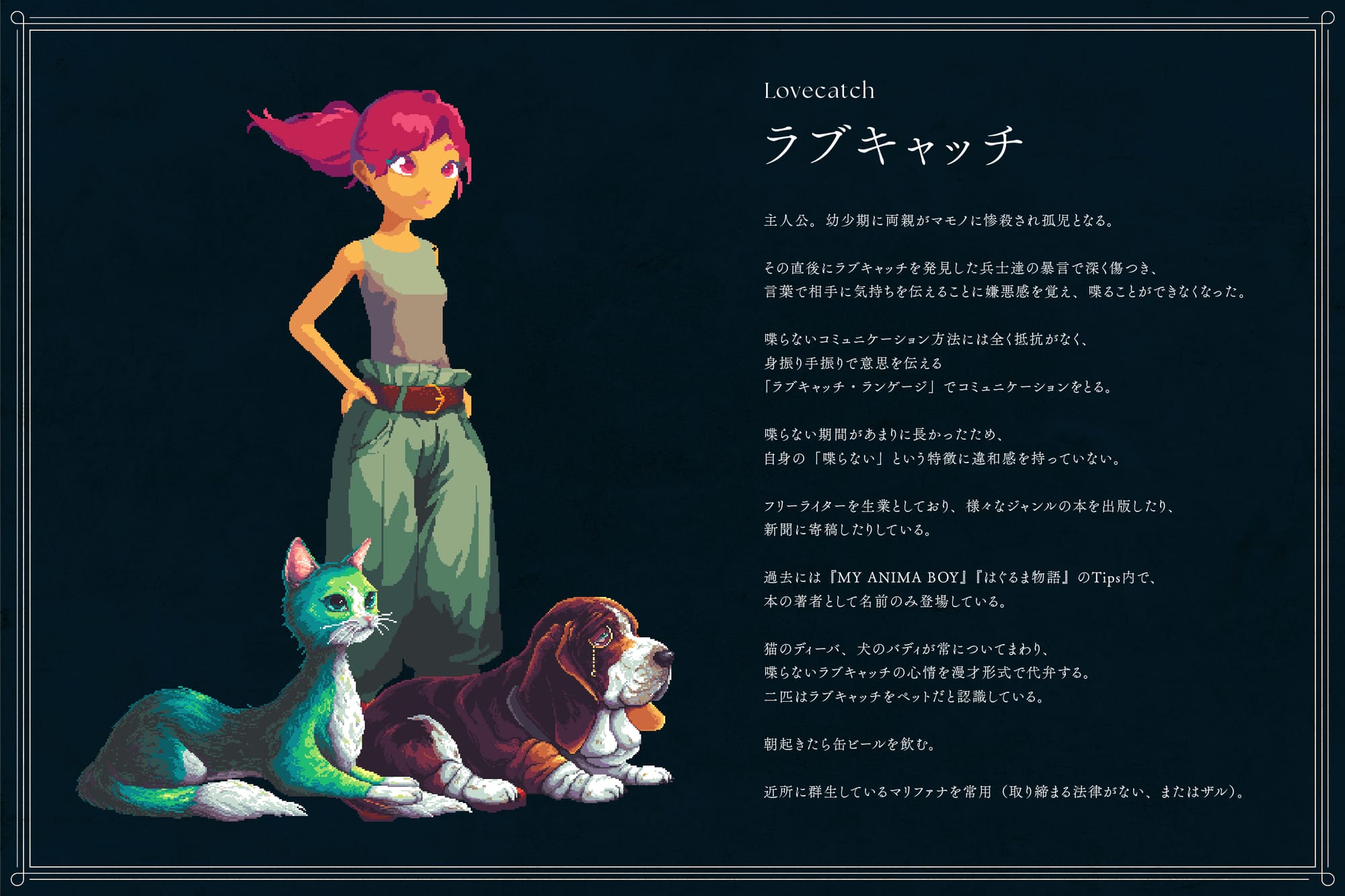 『くつひも物語』は、本稿の執筆時点で公式サイトやSteamストアページなどが公開されておらず、詳しいストーリーは不明だが、フリーライターの女性主人公ラブキャッチを中心に据えた、マモノが存在する世界が舞台のビジュアルノベルゲームとなるようだ。