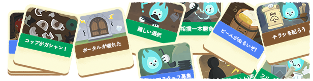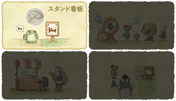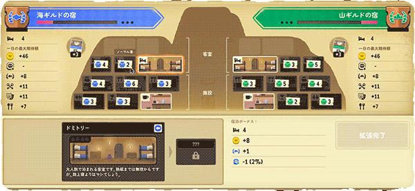 寄ってらっしゃい、見てらっしゃい!お宿にもっと客を呼び込むために、スタンド看板を設置したり、屋台を出したり、栄養ドリンクやルーレットなどで冒険者の心を掴もう。ただそれも全てタイミングを見計らってやること。両ギルドの冒険者たちがお宿の前で鉢合わせになる状況だけは避けたい。たまには、その場で1ターン休ませるのも、悪くない策略なのかも。