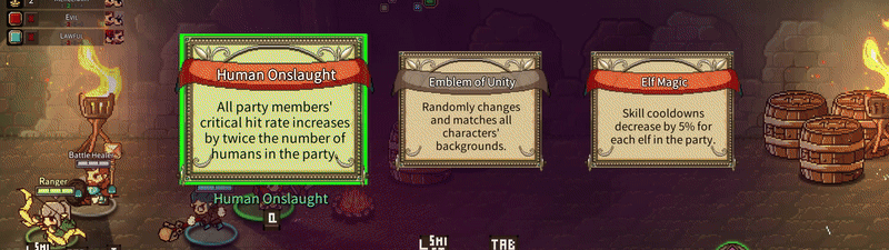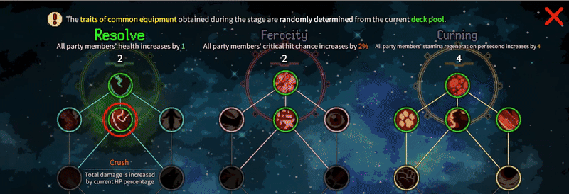 本作のローグライト要素についても触れておこう。クエストでは、分岐したマップが自動生成され、ルートを選んでボスのエリアを目指していく。止まったマスの種類に応じて、パーティメンバーの募集、装備品やスキルの強化など、さまざまな報酬が手に入る。