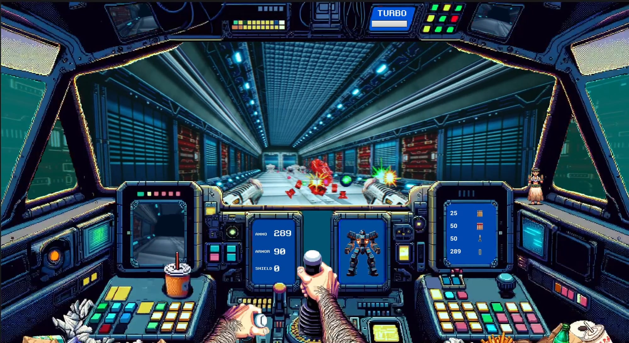 90年代の『Doom』『Shogo: Mobile Armor Division』『アーマード・コア』からインスピレーションを受けたという本作は、古き良き時代の16ビットの雰囲気に近づけたレトロなグラフィックで制作されていて、上手い具合に本作にマッチしているようだ。