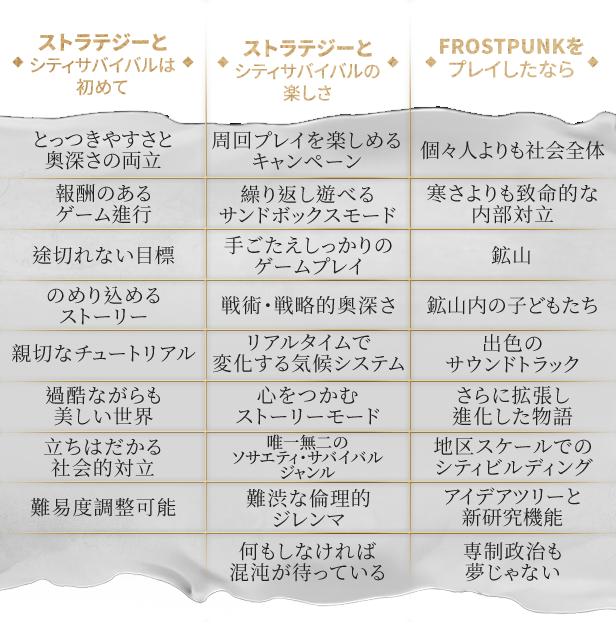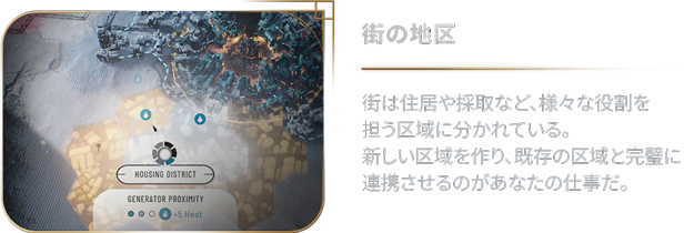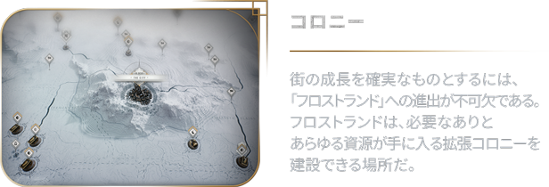 終わりなき冬に閉ざされた世界。人類の生存の可能性を繋ぐには、街を拡大するほかない。街の成長のためには石炭や石油といった資源が欠かせない。また住民には十分な食料を提供し、寒さに凍えないようにする必要がある。「Frostpunk 2」におけるあなたの使命は、終わりなき需要と供給のサイクルに対応することだ。