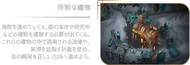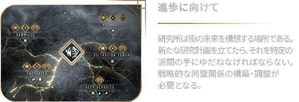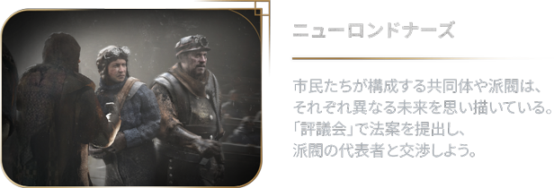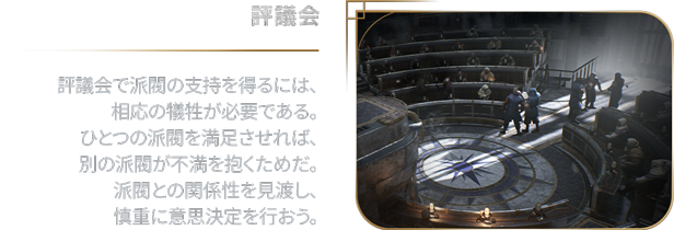 街の住民は、あなたの政治に意見を述べたいと思っている。各派閥の信条や理想とする未来はそれぞれ異なるが、権力への渇望だけは共通している。評議会での同盟関係の構築は慎重になされなければならない。