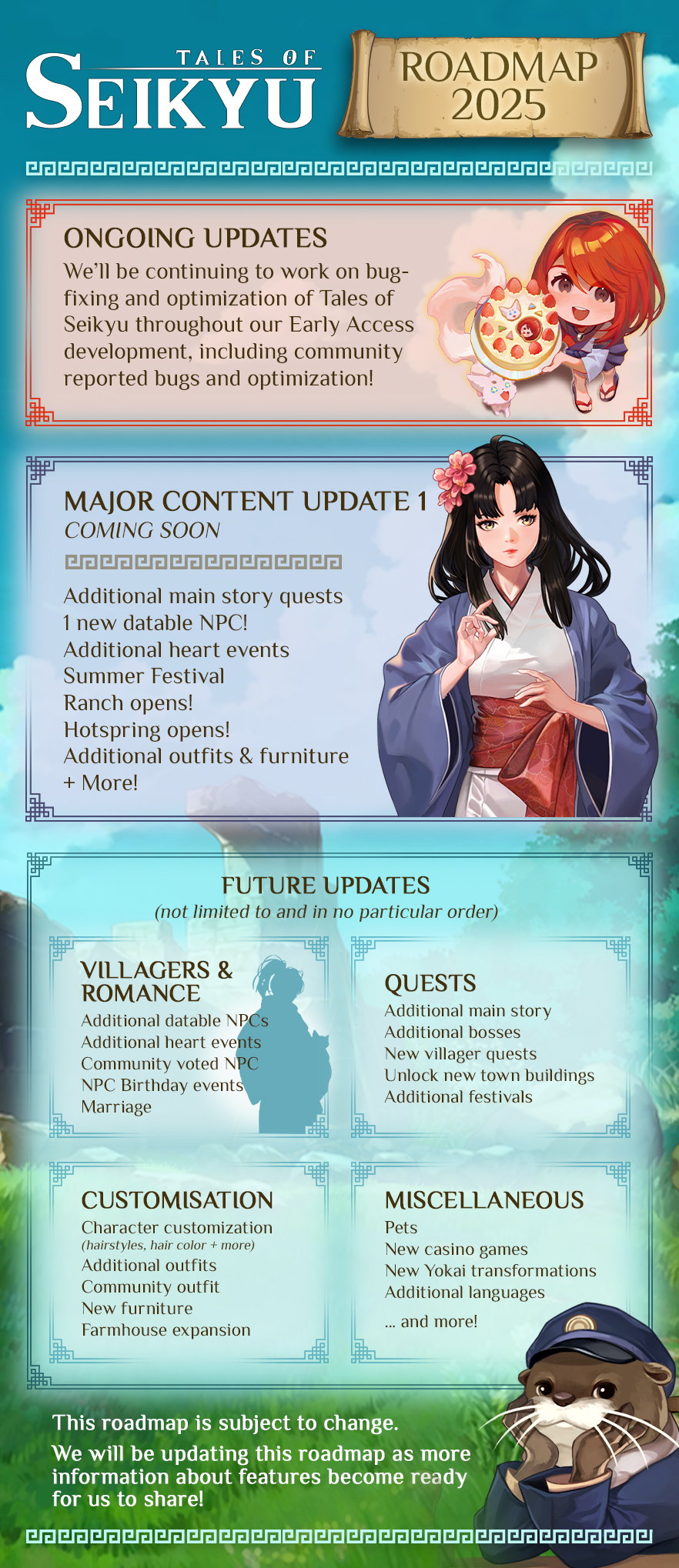 さらに将来的には、メインストーリーの拡張(クエスト、ボス戦、町の拡張)。デート可能なNPCの追加、恋愛イベント、誕生日イベント、結婚システム。カスタマイズ性の強化や、ペット・妖怪変身の種類の増加、カジノゲームなどの新機能の追加が予定されている。