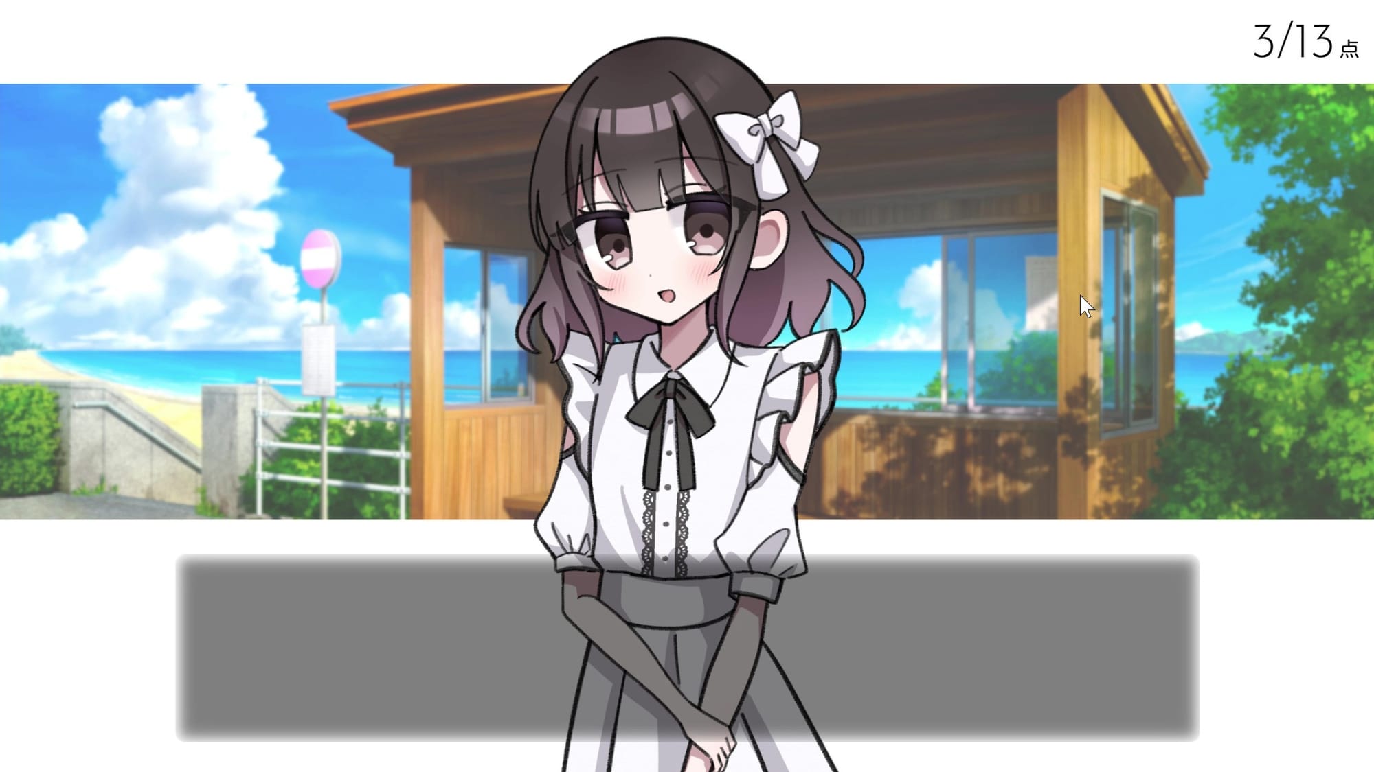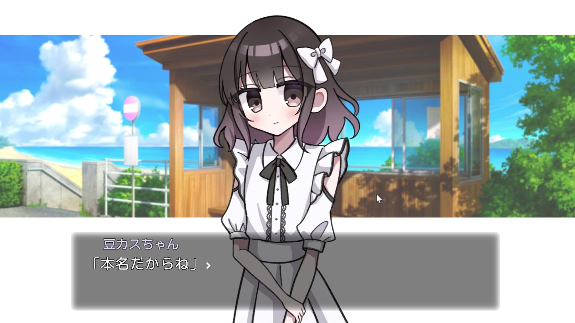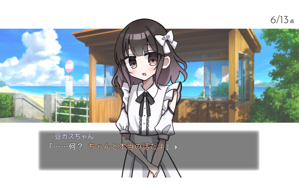 入道雲が広がる青空のもと、少し懐かしい雰囲気のバス停で、偶然とある少女と出会うところからゲームは始まる。少女の姿はとても可憐で、優しげな声でプレイヤーへと語りかけてくれる。導入だけで言えば甘酸っぱいひと夏の物語が始まる! といった感じだが、そんな彼女が名乗った名前は「豆カスちゃん」。正直信じがたい出会いだ。