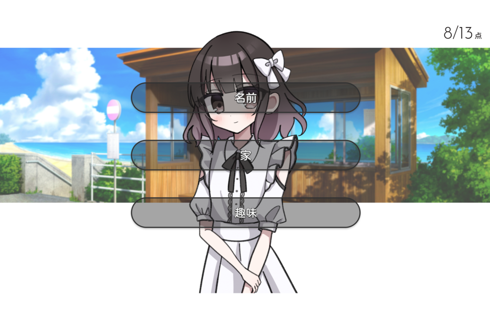 クイズが終わると、暇つぶしに付き合ってくれたお礼として豆カスちゃんに質問をすることができる。名前、家、趣味について聞くことができるが、ここでも相変わらず嘘をつかれることがある。だが、豆カスちゃんの振る舞いはボイスも相まってどこか愛嬌があり、その嘘すらもかわいく見えてくるのが本作の魅力と言えるかもしれない。