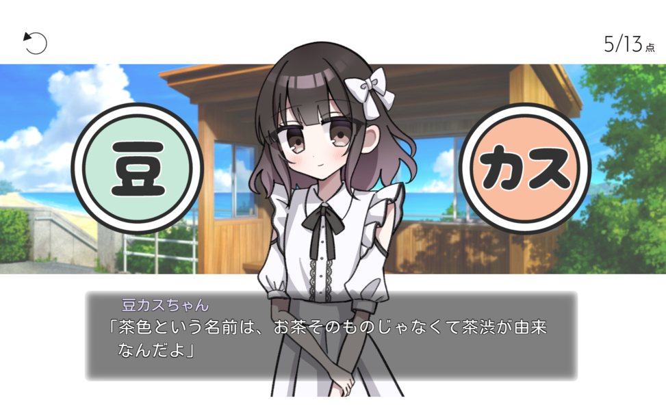 そうして出会った豆カスちゃんは、「ねえ、知ってる?」という問いかけとともにさまざまな出題をしてくる。一見それっぽいものから、とても信じられないような内容まで、色々なことを吹き込んでくるが、いずれも真偽判定が絶妙なものばかりで思わず唸ってしまう。