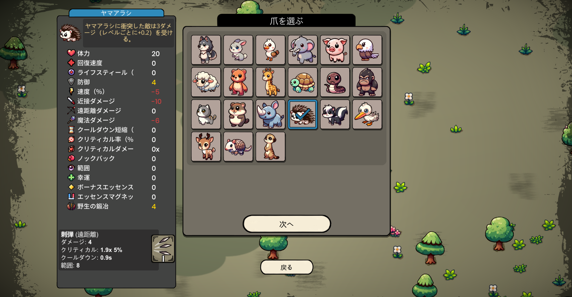 本作は、まず初めに操作する動物を選択する。動物にはそれぞれ独自のステータスとパッシブスキルがあり、例えば「10回目の噛みつき攻撃でHPを一部回復する狼」や「武器のニンジンのアップグレードコストが半減するウサギ」などがいる。