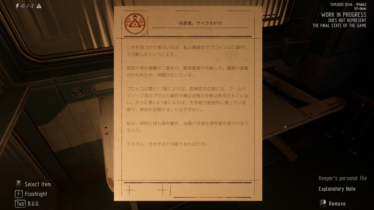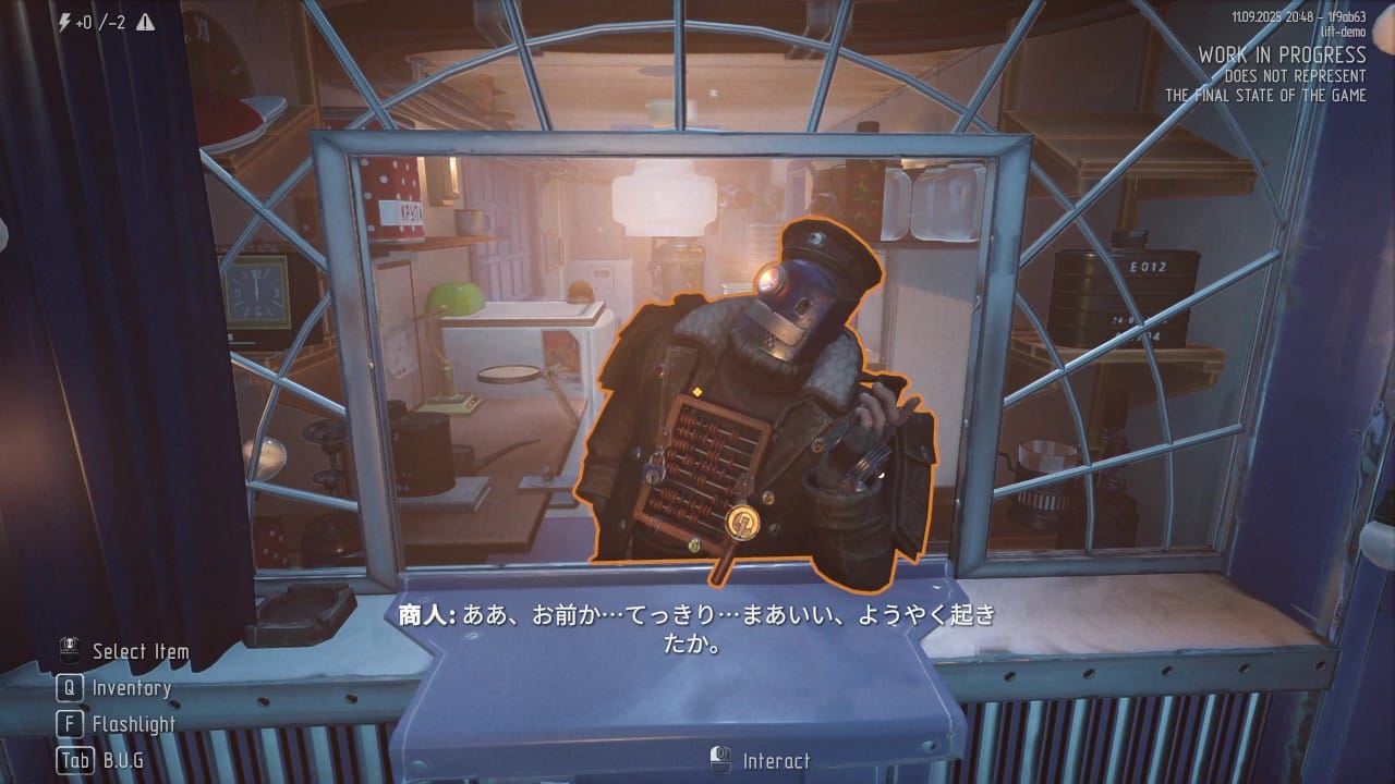 そして何より、本作に登場する“人物”はプレイヤーたる主人公だけではないことも特筆しておきたい。デモ版では「商人」と名乗る男性に出会うことができた。正体不明の彼だが研究所で何が起きたのか知っているようで、現状に反してフラットな態度で気さくに話をしてくれる。蓋をしたように閉じて静かだった雰囲気から一転、ひと息つけるような心地だった。