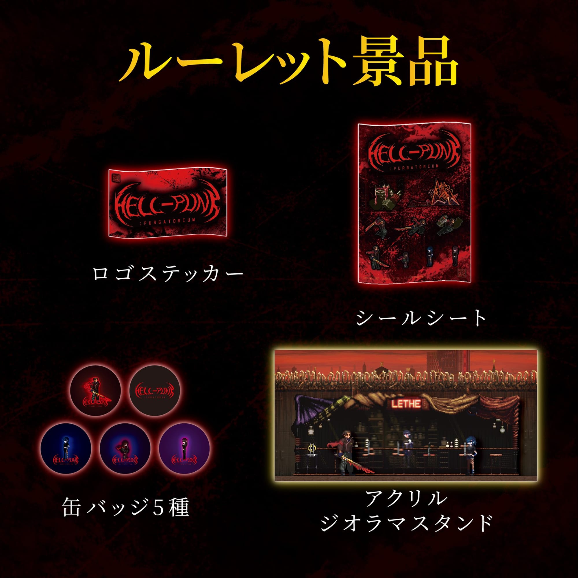 Steamのウィッシュリスト追加、SNSフォロー、デモ版の試遊によって、その場で複数回グッズの抽選に参加できるとのこと。ロゴステッカー、 キャラクターとモンスターのシールシート、バッジ5種類のセット、キャラクターや世界観を小さなジオラマ風にデザインしたアクリルスタンドが用意されている。グッズは数量限定のため、なくなり次第終了となる。