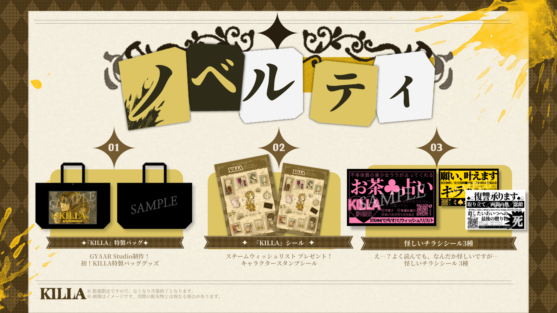 ブースでは、GYAAR Studio制作の『KILLA』特製トートバッグと、「怪しいチラシ風シール3種」が無料配布される予定だ。さらに、Steamのウィッシュリスト追加で、キャラクタースタンプシールがプレゼントされる。いずれも数量限定で、なくなり次第終了となる。