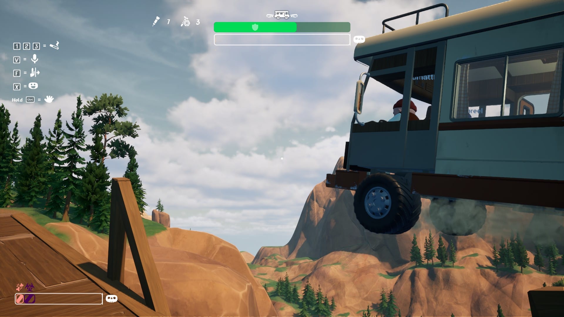 物語の舞台は、休暇の帰り道にマバッツ渓谷で立ち往生してしまった4人組。彼らはRVを運転し、ルート65を目指して危険な山道を進んでいく。一見すると「のんびりドライブゲーム」に思えるが、実際はオブジェクトやアイテムを上手く活用し、アスレチックコースのような悪路を仲間と共に乗り越える「サバイバルアクションゲーム」だ。