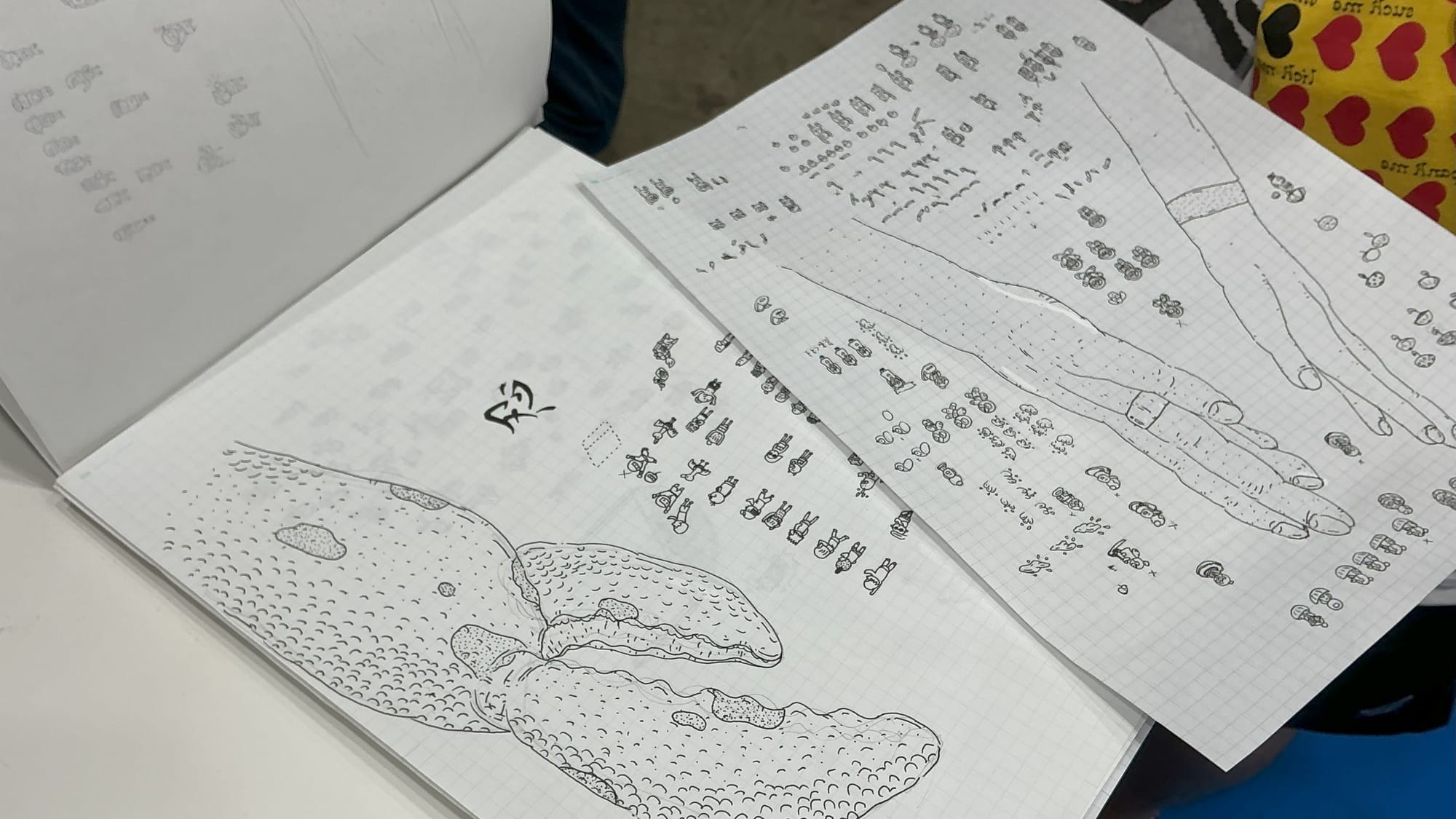 試遊後、熊沢氏から本作の原画を見せていただいた。ボールペンで細かく書き込まれた手描きの世界は、思わず「うわぁ!」と声が出るほど圧巻だった。