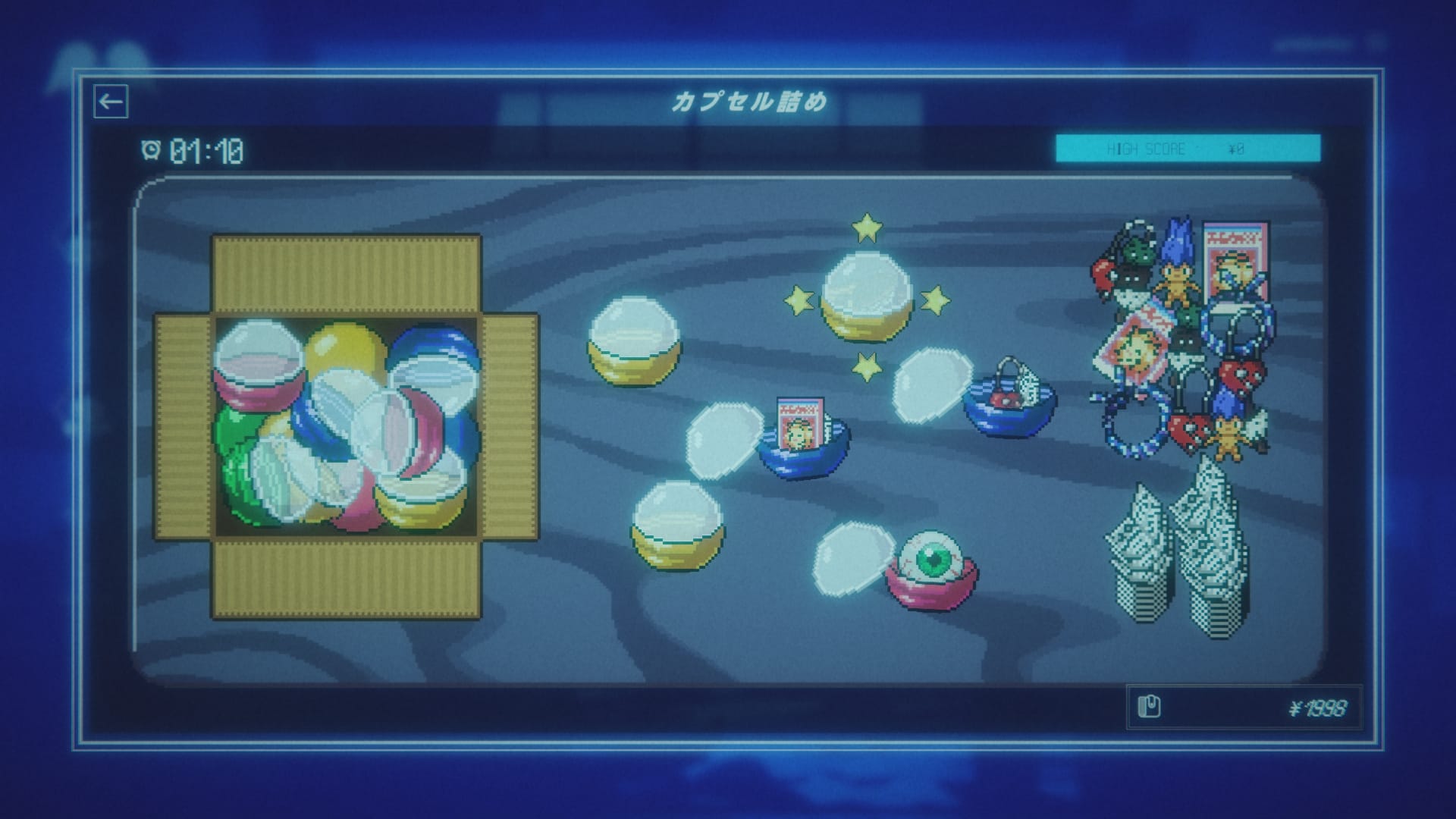 また、試遊版ではノベルパートのほか、生活費を稼ぐためのミニゲームも遊ぶことができた。筆者は今回「カプセル詰め」をプレイしたのだが、こちらはひたすらカプセルへの商品入れを行っていくという内職がゲーム化されている。内職以外にもマップ探索や、玲奈の代わりに「デジタルペット育成ゲーム」でペットのお世話をするミニゲームなど、さまざまな遊びが製品版では実装されるようだ。