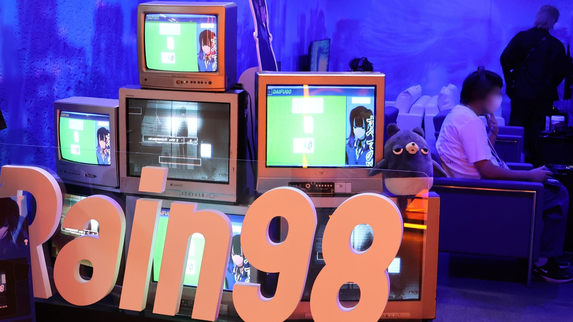 イベントホール内の一角に並んでいたのはゆったりとくつろげるソファに、ゲームPVを流す高画質モニター……ではなくブラウン管テレビ。蒼い光に照らし出された『Rain98』のブースは、いい意味でTGS2025らしくなかった。
