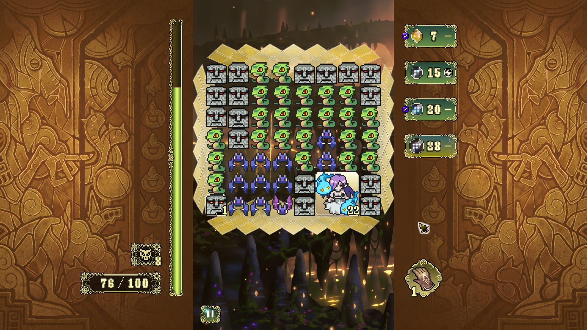 ウェーブ制で進行する本作では、プレイヤーには行動ポイントが割り振られ、使い魔に指示を出すたびに消費されていく。ポイントが尽きるとウェーブ終了となり、敵が残っていれば反撃を受けてMPが削られてしまう。一方で、ウェーブ中に倒した魔獣の数に応じてMPが回復もするため、どれだけ攻めて盤面を整えられるかという駆け引きが生まれるわけだ。