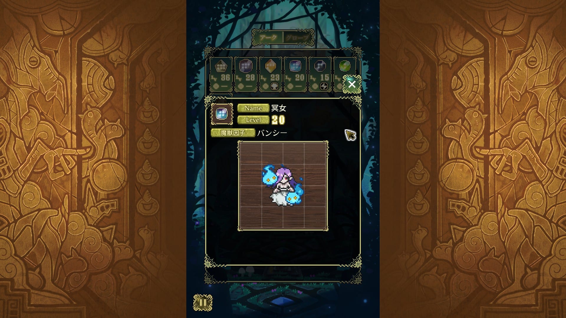 本作において特にユニークなメカニクスが「魔獣錬成」だ。素材となる使い魔と錬成用の魔石<アーク>を組み合わせ、巨大種と呼ばれる使い魔を生み出す術となっている。素材の合計レベルがアークの要求値を満たし、ブロック形状どおりに使い魔を並べれば錬成が成立する仕組みだ。