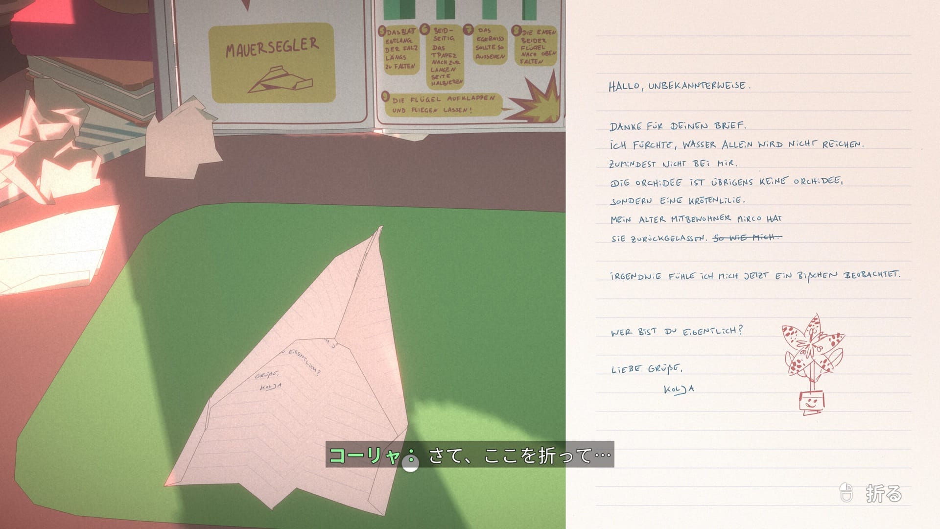 部屋に置かれた家具や小物に触れていくと、コーリャの生活が少しずつ浮かび上がる。彼女の人となりを想像しながら手紙をしたため、紙飛行機に折っていくその仕草が、彼という人物に静かに輪郭を与えていくのだ。紙飛行機が床にそっと落ちるときのかすかな音でさえ、この一日の物語を静かに彩ってくれるかのようだ。