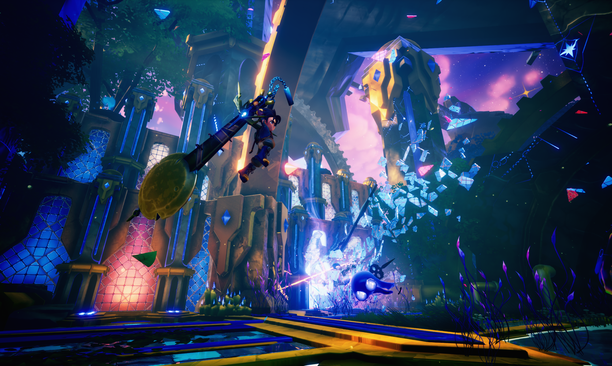 二段ジャンプやローリングなど基本的なアクションは最初から備わっており、体験版範囲ではフック移動も解禁される。序盤はプラットフォームとして難しい箇所はなく、基本的な操作の反復練習を目的としたようなシンプルなステージ構成で、比較的サクサク進むことができた。とはいえ、通貨などが得られるちょっとした脇道が随所にあり、決して淡白なマップではない。足場から落ちた際のダメージがなく、直前の地点からすぐにリトライできる点も、気兼ねなく寄り道できる楽しさに繋がっている。
