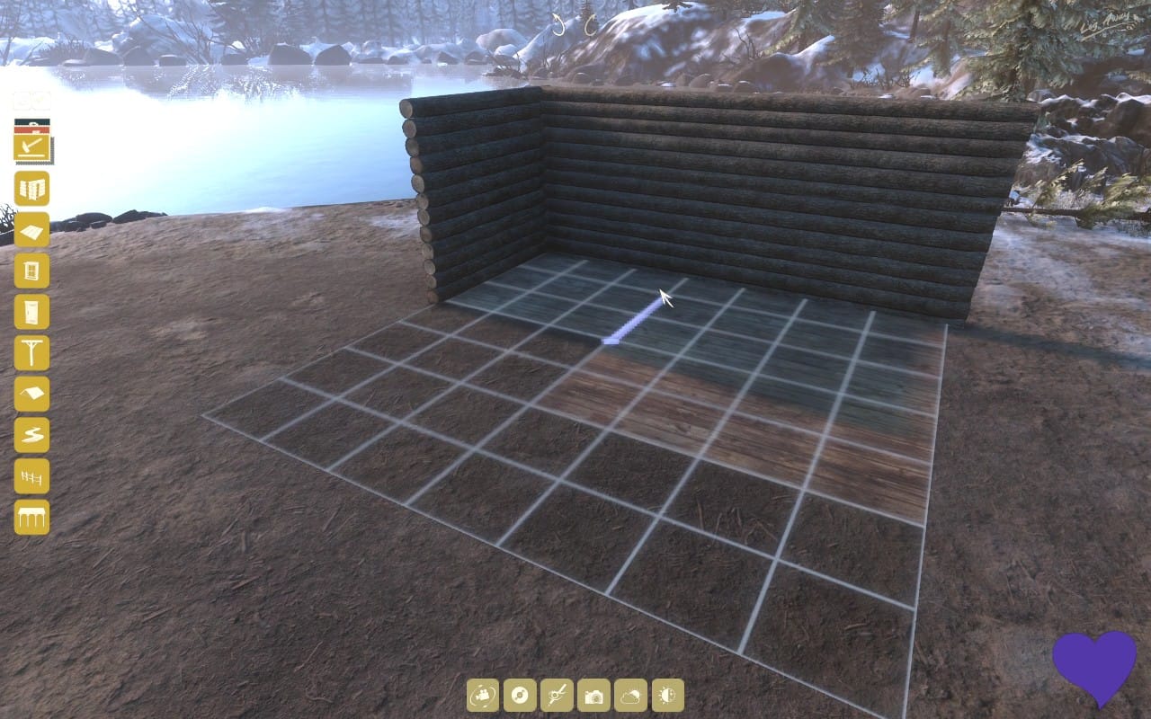 ロケーションごとに建築可能な範囲に指定があり、まずは建築モードでそのマス目にあわせてクリックかドラッグで床を敷き、壁を貼っていく。材質や色味もいくつかから選べるので、ロケーションの雰囲気と合わせて見比べてみよう。