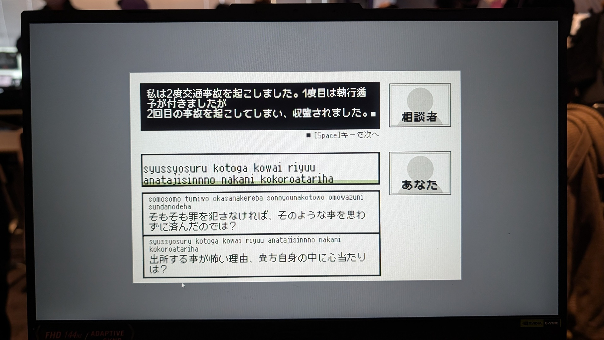 また、本作は単にインタビューをこなすだけのゲームではない。主人公にはある「復讐」という目的が隠されており、傍にいるディレクターに悟られないよう、嘘をつき続けながら対話を進める局面もあるとのことだ。現時点では未実装だったが、打った文字がその場で機械音声によって喋り上げられる演出が加われば、プレイヤーと主人公の境界はさらに曖昧なものになりそうだ。