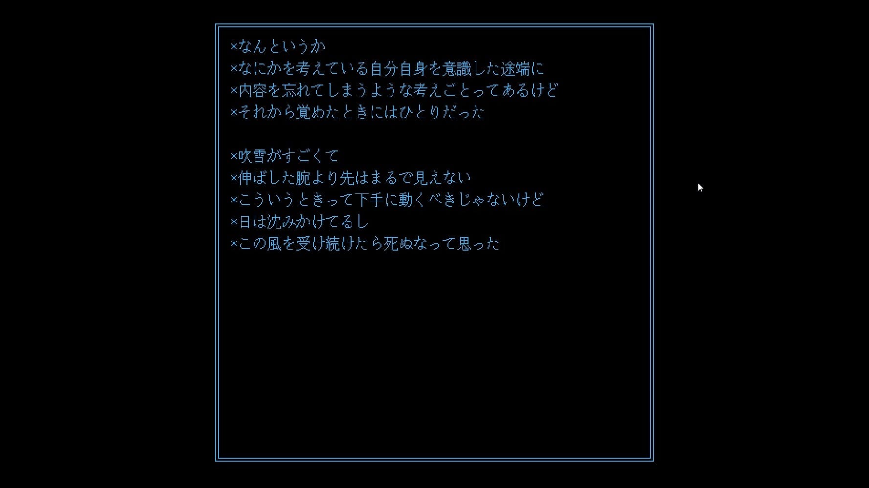 その人物の独り言は続き、どうやら吹雪によって遭難してしまった様子であることが知らされる。だが、こちらにできることは左クリックで発光することだけで、何も関与できない。