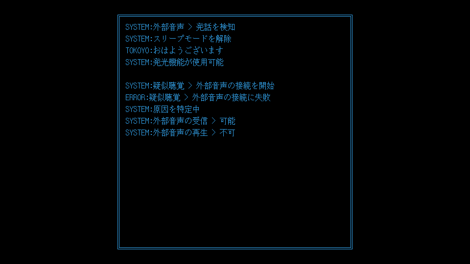 また、開幕のシステムログで示される「常夜プログラム」などのように、ときおり登場する意味深なワードも本作の世界観へ惹かれる要素だった。