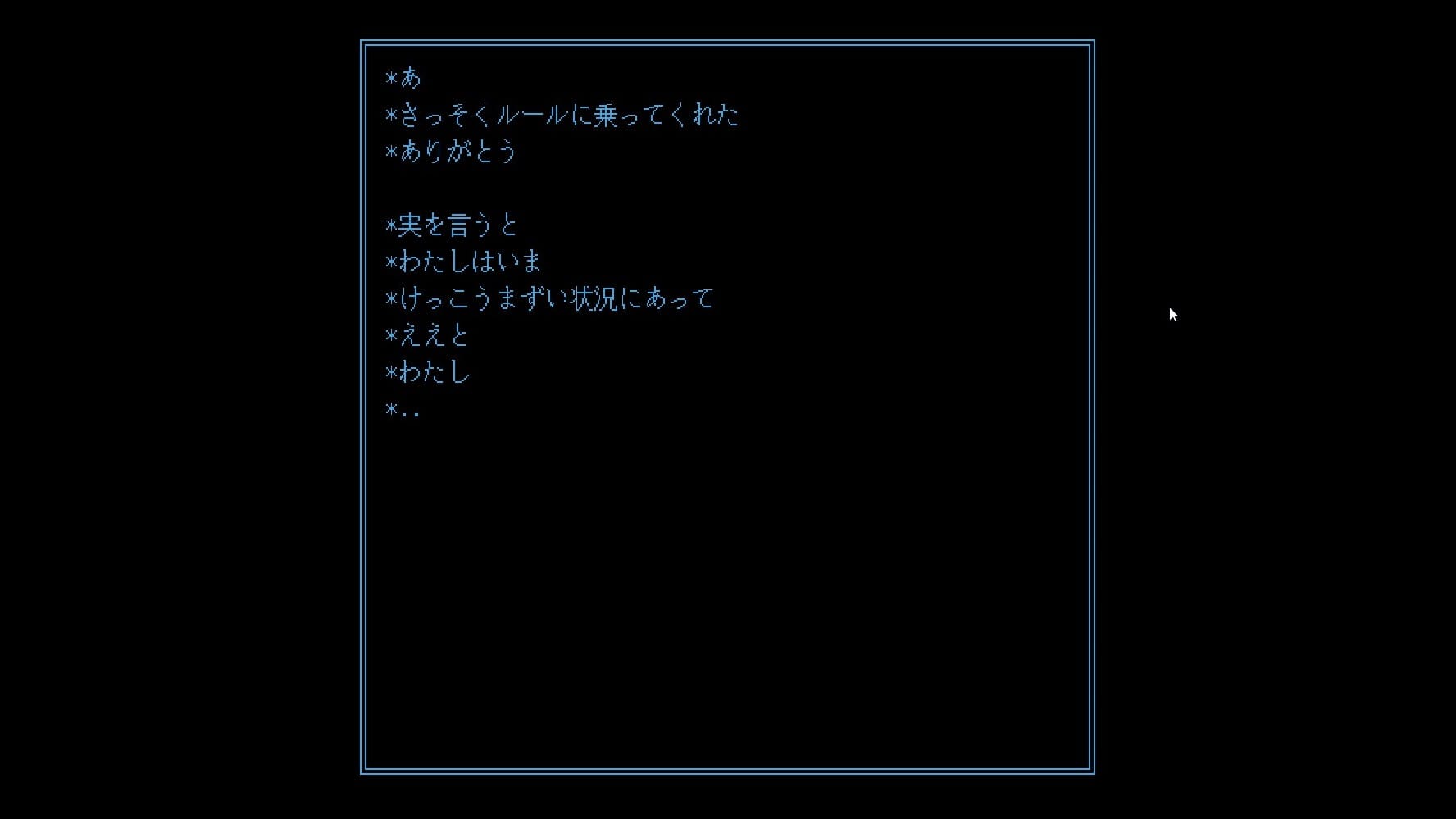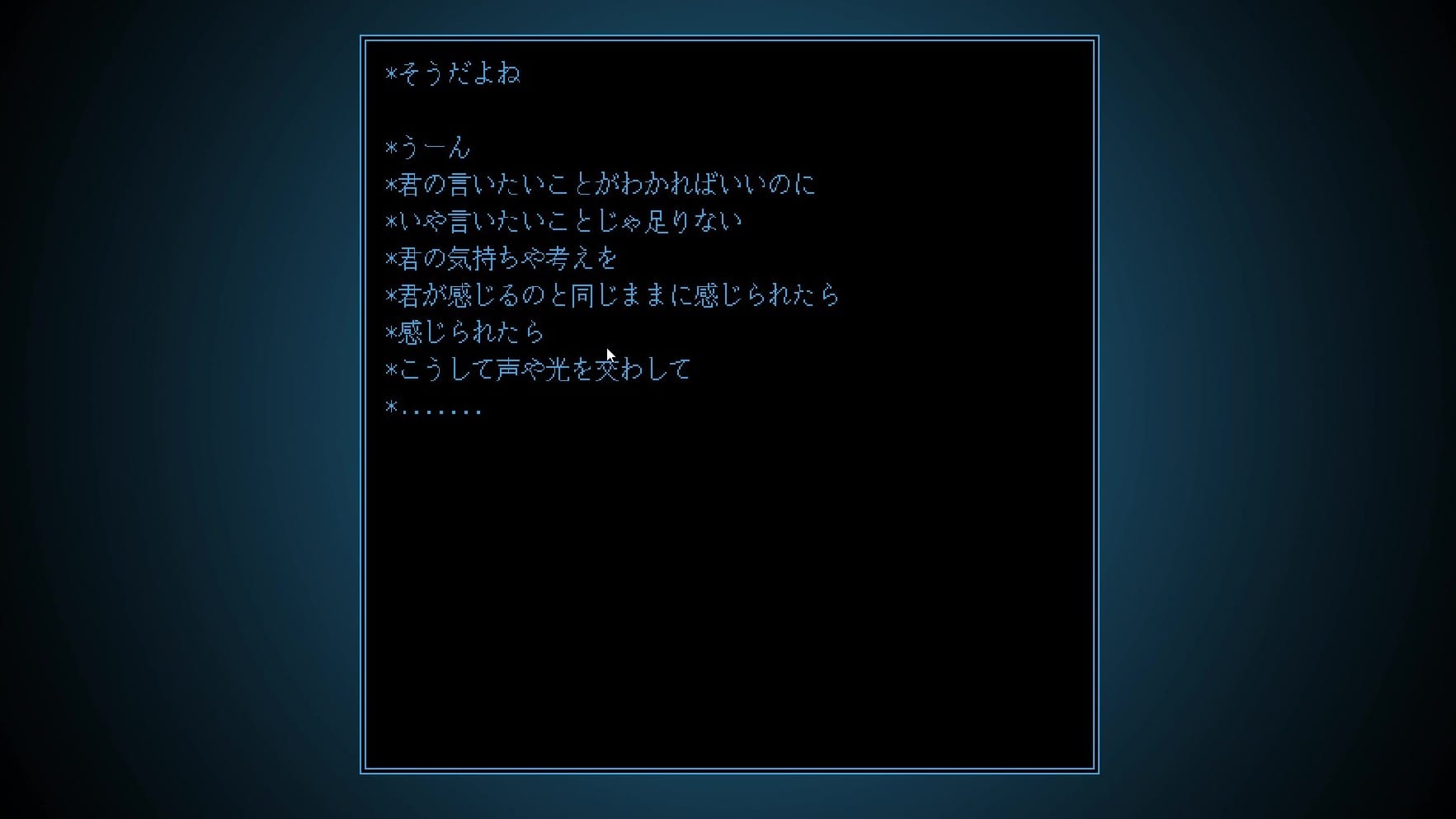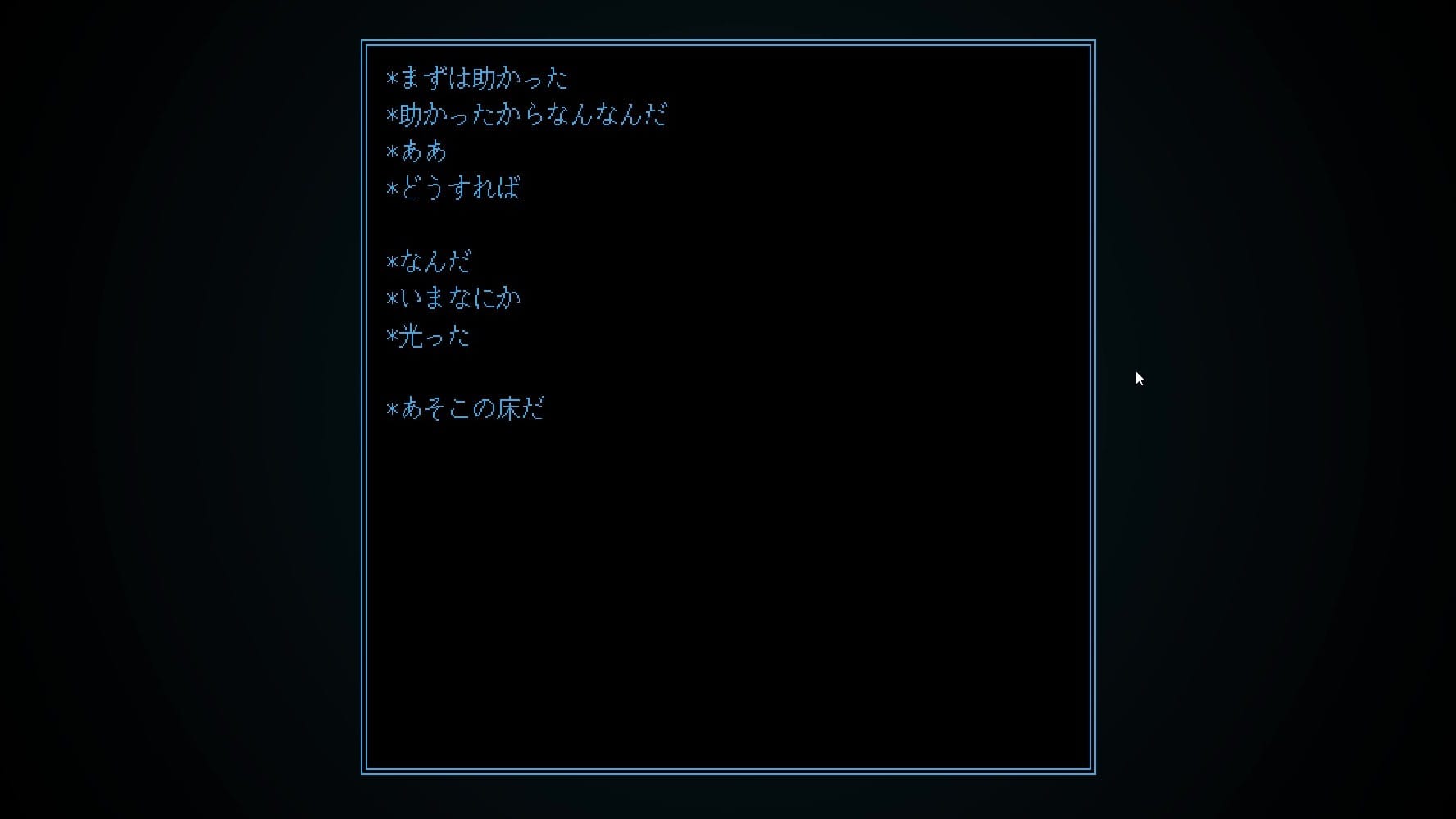 ここがどこなのかは分からず、世界観も何も知らされない。操作も「左クリックをするとほのかに背景が光る」以外は何も起こらず、まさに暗中模索の状態から始まる。