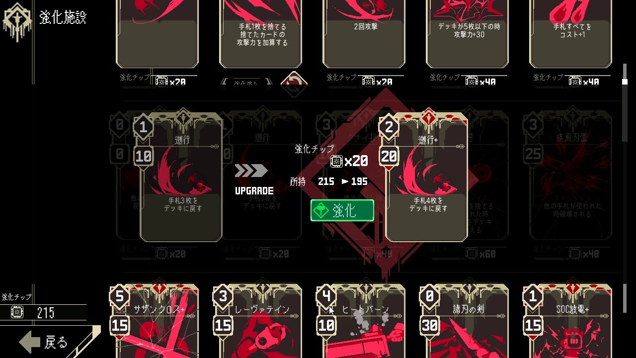 なかでも特筆すべきは、新要素であるカード強化だろう。ストーリーを進めると解放される「強化施設」では、敵を倒すごとに入手できる「強化パーツ」を使って、解放済みのカードを強化することが可能になる。与ダメージが強化されるものや効果が追加されるものなどさまざまで、強化後・強化前どちらで使用するかも同施設で変更可能だ。使ってみると意外に強化前のほうが回りが良かった、ということもあるので、デッキごとに調整できる仕様はありがたい。