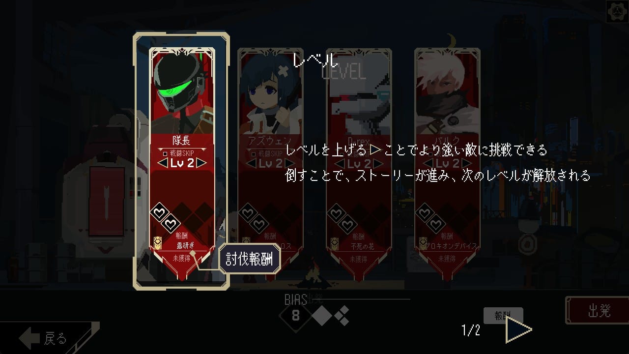 また、デモ版では周回を進めるごとにカードが追加されていたが、製品版では追加のタイミングや内容が明確に可視化。敵のレベルを選択できるようになり、高レベルに挑み勝利するほど「BIAS」と呼ばれる段階が上昇、一定値に達するとストーリーやカードの解放がおこなわれるかたちに整理された。低レベルで周回して強化パーツを集めたり、解放されるカードが欲しいものでなければ苦手な敵のレベルを低くしておいて、ほかのカードを解放・強化してから挑むこともできたりと、よりプレイしやすくなった印象だ。