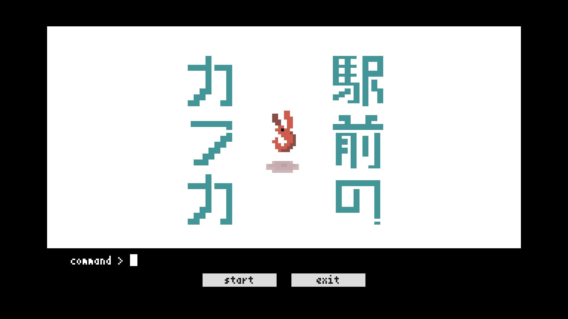 ゲームを始めると、タイトル画面下に「command」と表示される。「start」と「help」というボタンこそあれど、クリックをしても何も反応はない。それもそのはず、本作は全ての操作をキーボード入力で行う。タイトル画面では「start」と打ち込むことで、ゲームが始まるという形になっている。