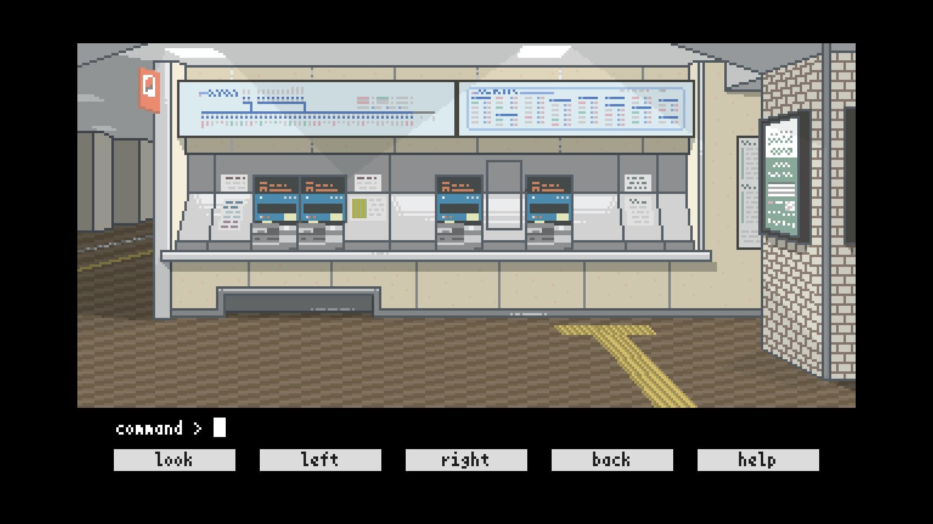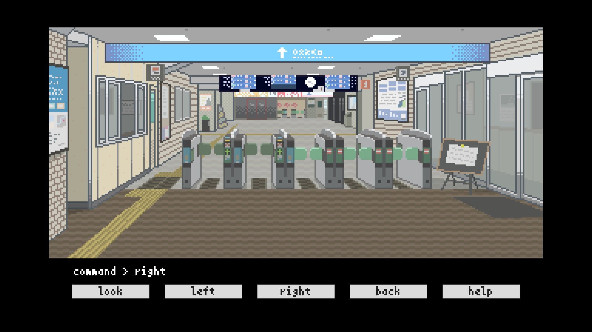 とある駅舎内からゲーム本編は始まる。まずは辺りの探索を行いたいところだが、ここでもキーボード入力によって操作を行っていく。たとえば、右に行きたければ「right」、左に行きたければ「left」と入力して移動するといった形だ。