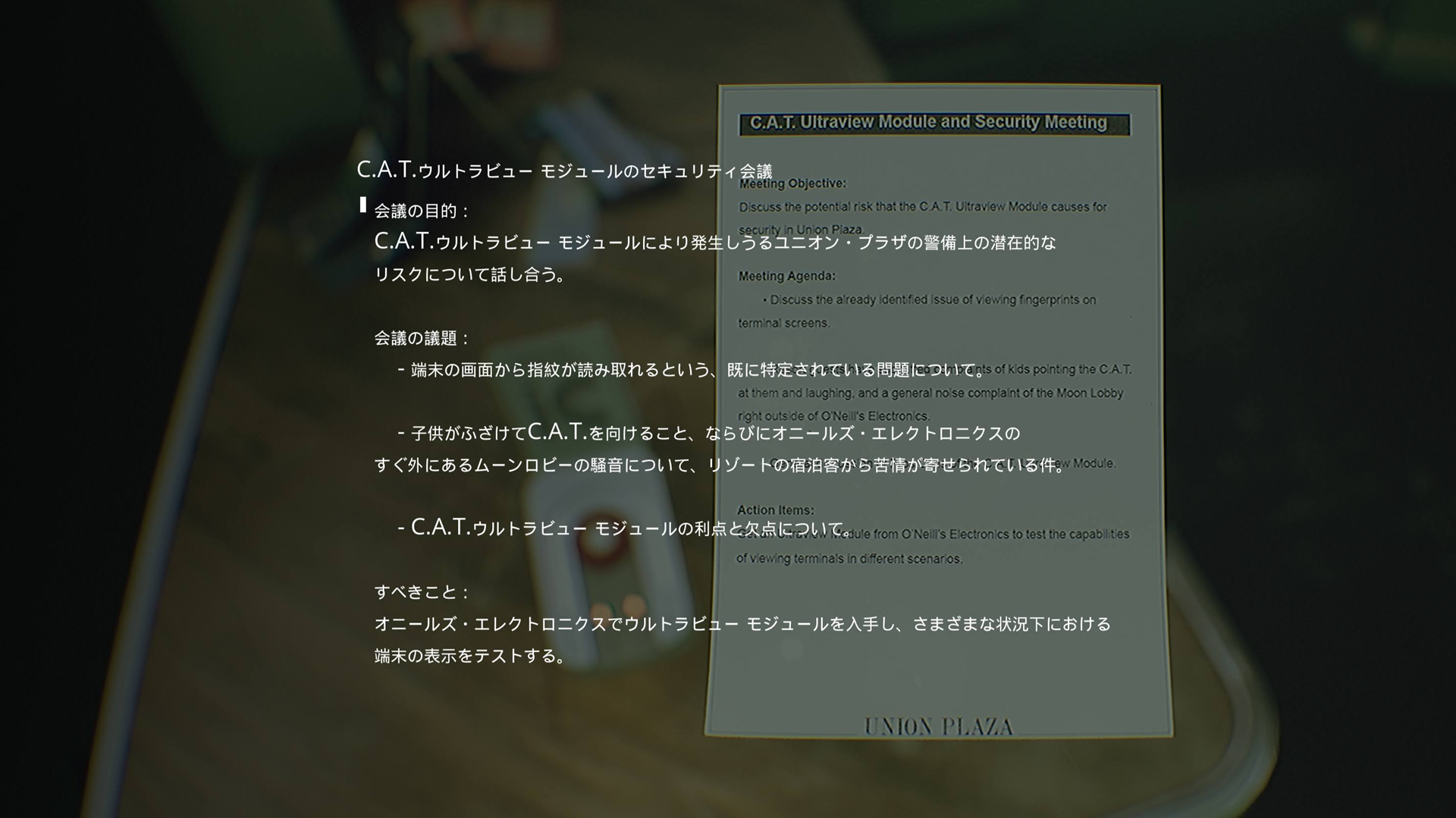 そのため、淡々と事実を伝える箇所では、それらをいかに違和感なくリアルに見せるか(各種文書であったり、ユニオン・プラザの施設案内であったり)に気を配り、一方で、職員同士のメールやゲーム後半の各職員の日記などでは、一人ひとりの感情がきちんと伝わるよう意識しています。