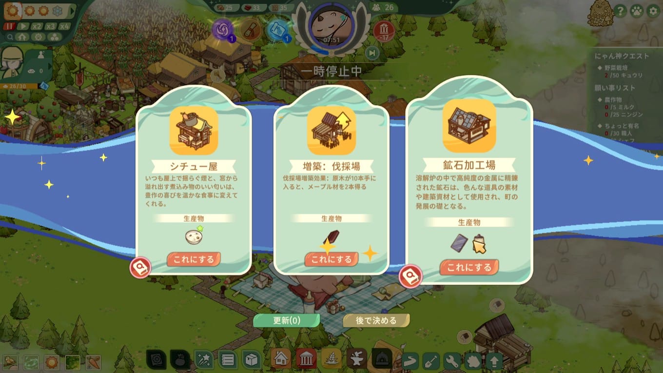 本作におけるひとつめのステージは難易度0で、クリアまでが実質的なチュートリアルだ。次回の難易度1からがいよいよ本番であり、ランダム要素がぐっと増える。例えば、獲得できる施設の設計図やモチモチの願いごとの内容などだが、これがなかなかやっかいなのだ。