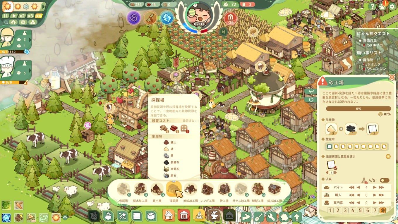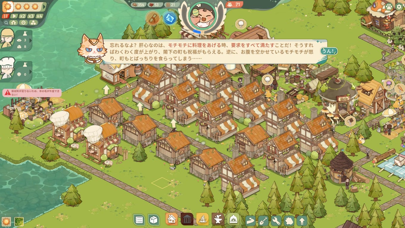 モチモチの要求を満たすだけの食料を確保するためには、幸福度を上げたり作業着を生産したりして労働者のグレードを上げる、農場や牧場では土地を広く使って収穫効率を上げるなどの工夫が必要だ。