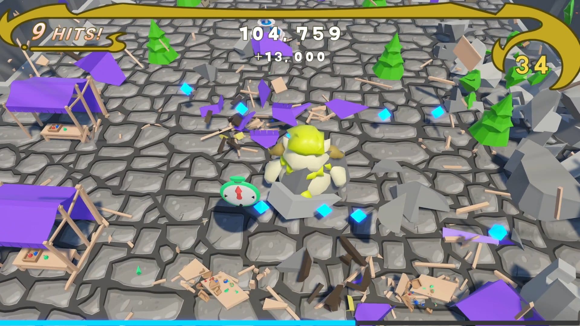 しかし、タイムアップ後に表示されるリザルト画面でのハイスコアを伸ばそうと思うと、いくつかの工夫や戦略が必要になってくる。例えば、緑色の建物を壊すと制限時間を延ばしてくれる時計が出現するので、その場所の把握と効率的に時計を回収できるルートを考える必要がある。