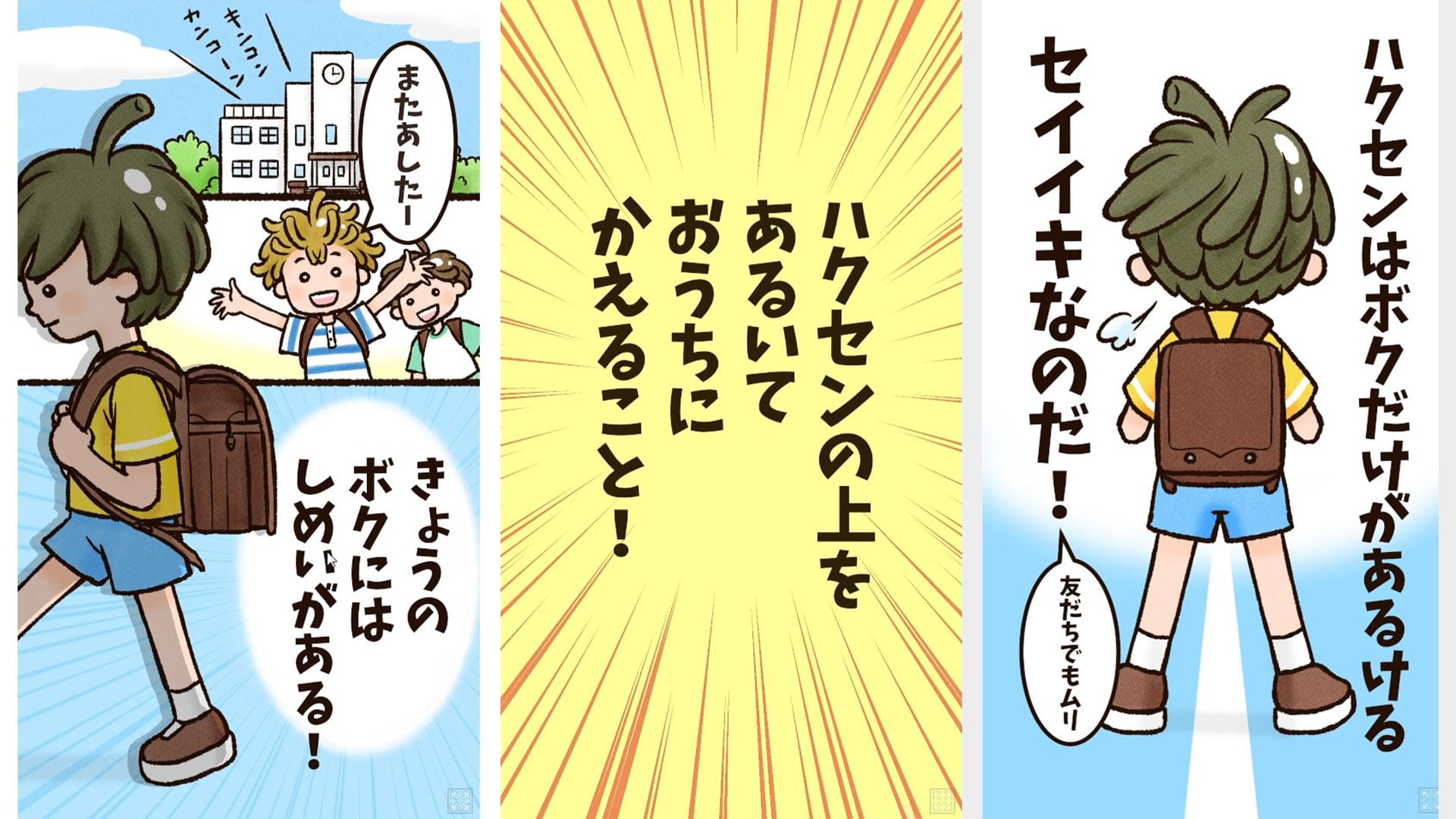 オタメガ:最初の案出しはブレインストーミングで、メンバーがそれぞれ2~3個ずつアイデアを出しました。その中で「小学生が道路の白いところを歩いて家まで帰る」というアイデアがあって、「ノスタルジーを感じてほしい」というテーマを軸にすることが、チームの多数決で決まりました。方向性が決まった後はスムーズに進んで、大きなトラブルもなかったですね。
