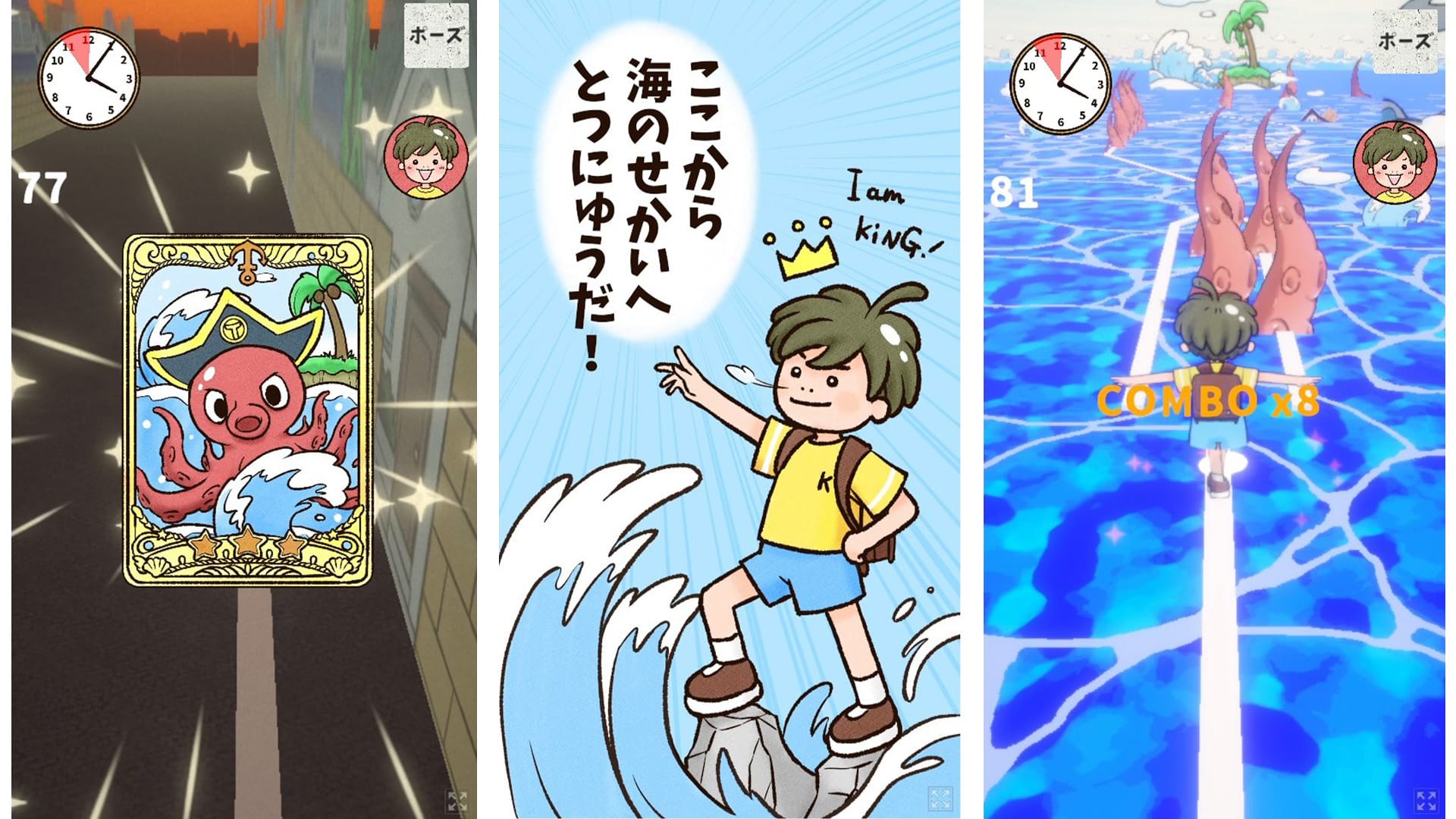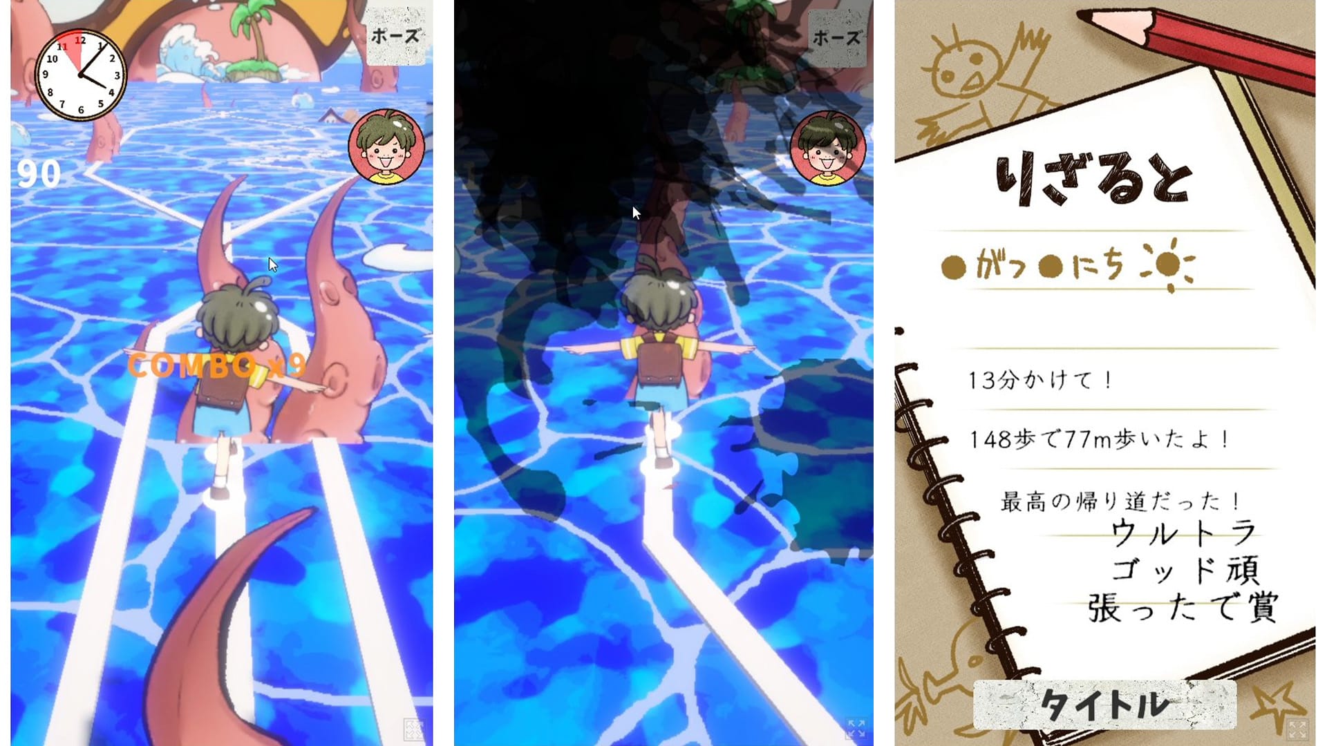 道中では白線が途切れ途切れになっていたり、足を平行に出して進まないといけなかったりする場所があり、少しずつ白線の上を歩く難易度が上がっていく。さらに、しばらく進むと少年が空想する海の世界に突入し、タコが墨を吐いてきたり足を地面から出したりしてきて、よりスリリングなゲーム展開に。