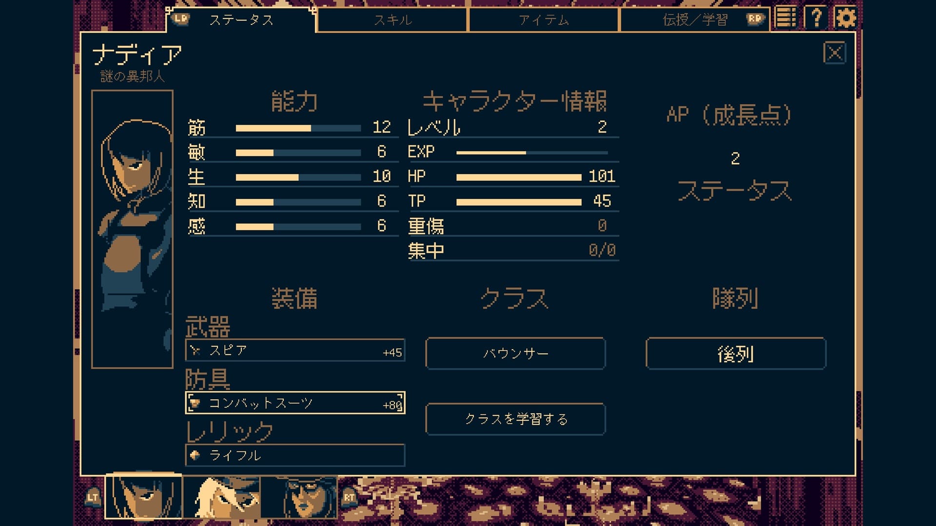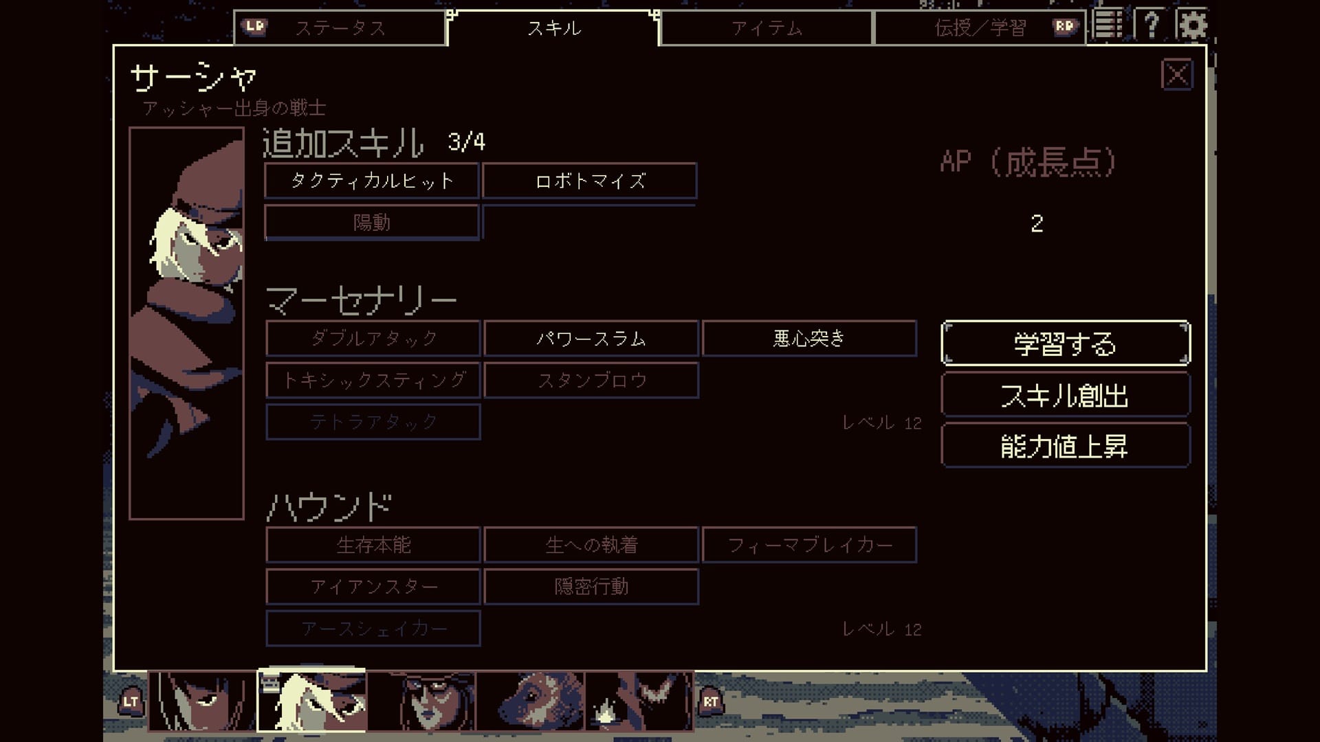 探索にさらなる深みを与えているのが、キャラクター間でのスキル伝授システムだ。これは単なる死後の救済措置ではなく、パーティ全員で生き抜くための「知識の共有」として機能している。各キャラクターのスキルを他者に分け与え、最適化していくプロセスは、非常に戦略的だ。全滅しないよう如何にパーティとして強化していけるか、そのシステマチックな協力関係が探索の推進力となる。