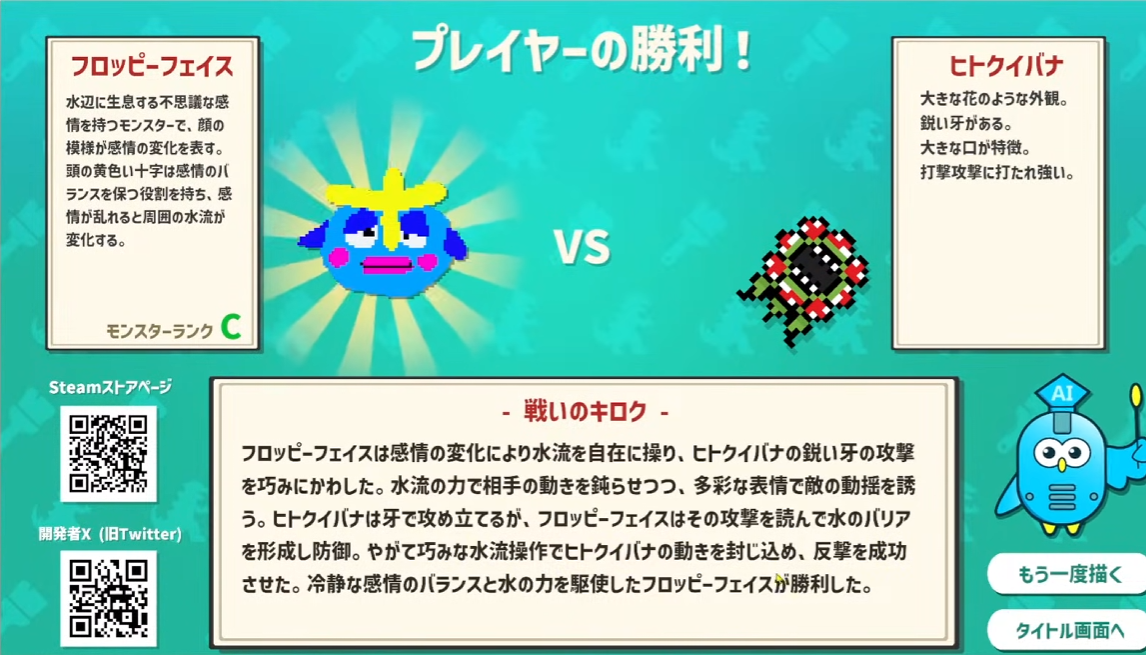 『AIドット絵バトル』の基本システムは、プレイヤーが描いたイラストの形状や色をAIが分析し、その「見た目」から強さや相性を判断して戦わせるというものだ。操作方法は極めてシンプルで、マウスで自由にモンスターを描くだけ。ゲームの目的は、対戦相手の能力を予測し、それに打ち勝つデザインを導き出すことだ。