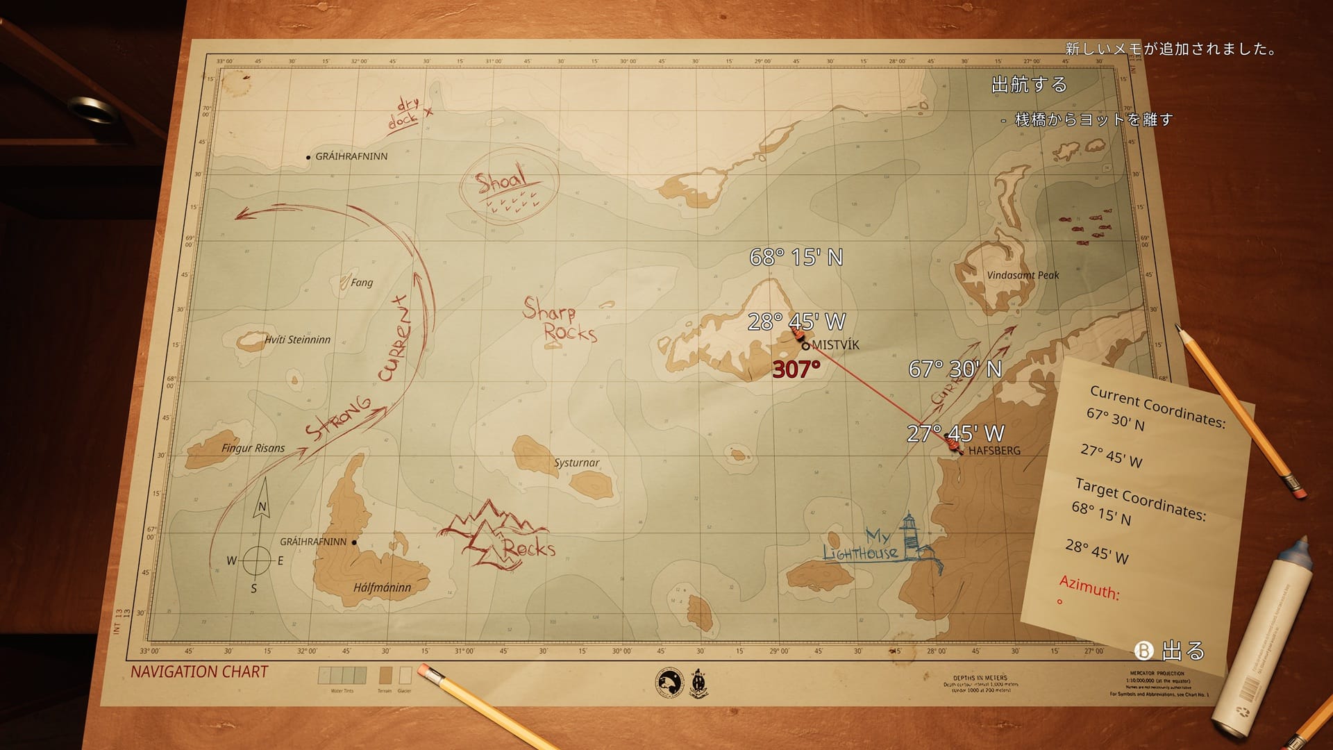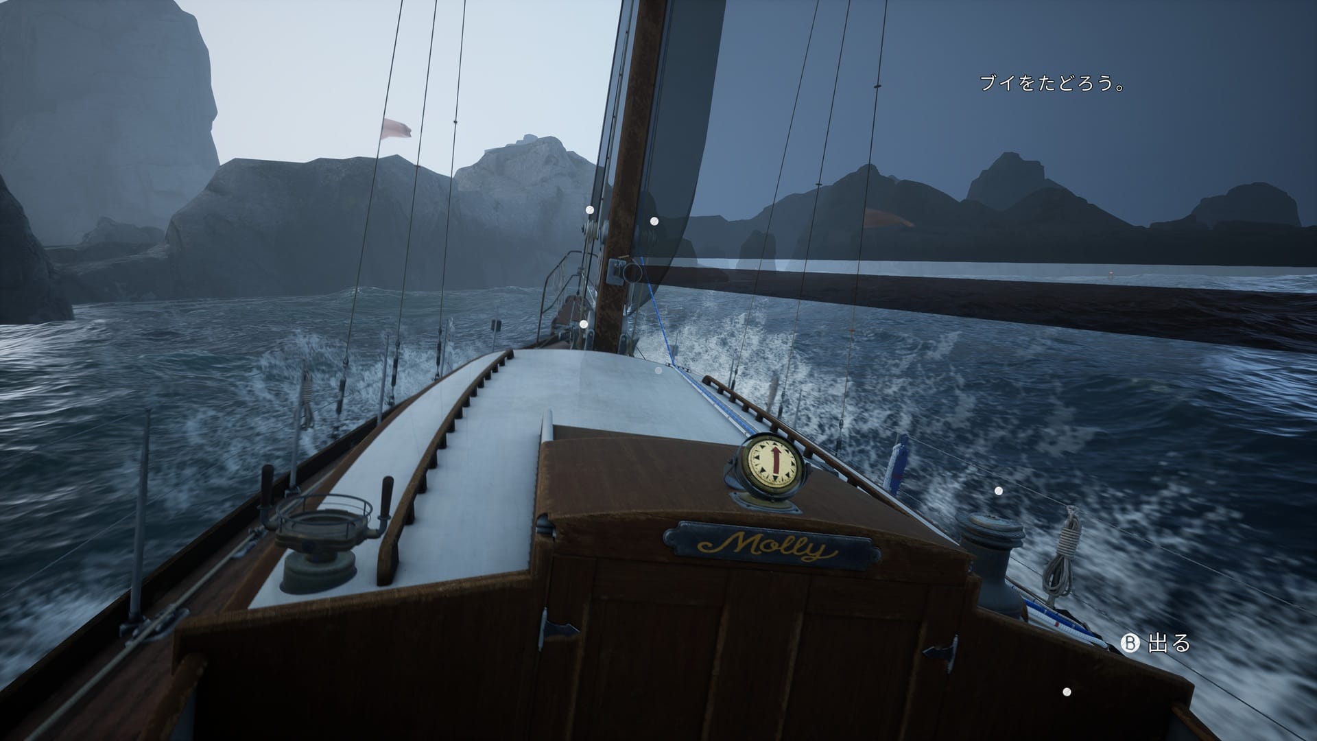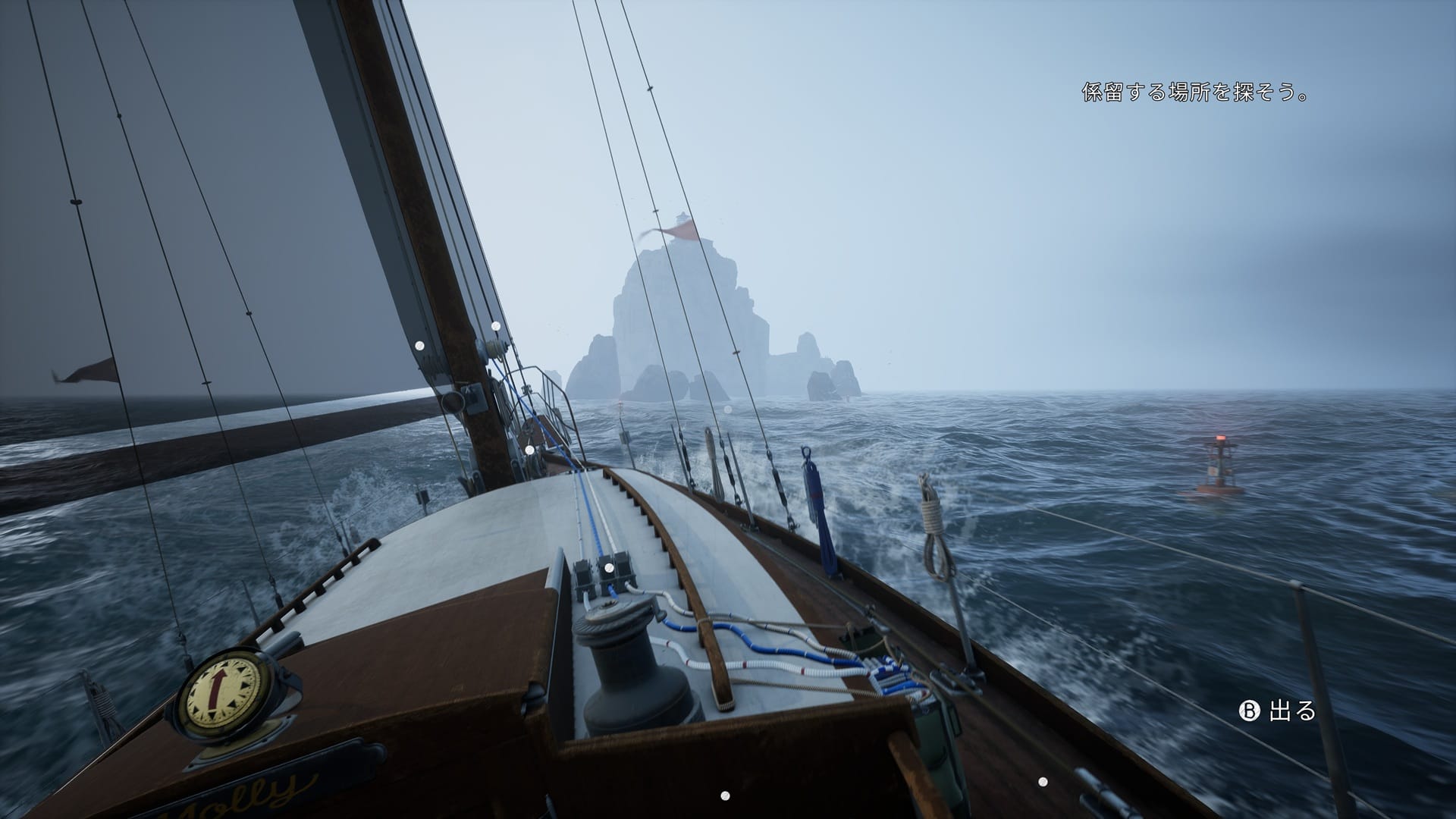 体験版における当面の目標は、失った方位を取り戻すための基準点として、バード島の灯台を再稼働させることにある。そして、この広大なフィヨルドを望む海域において、足となるのがヨットのモリー号だ。