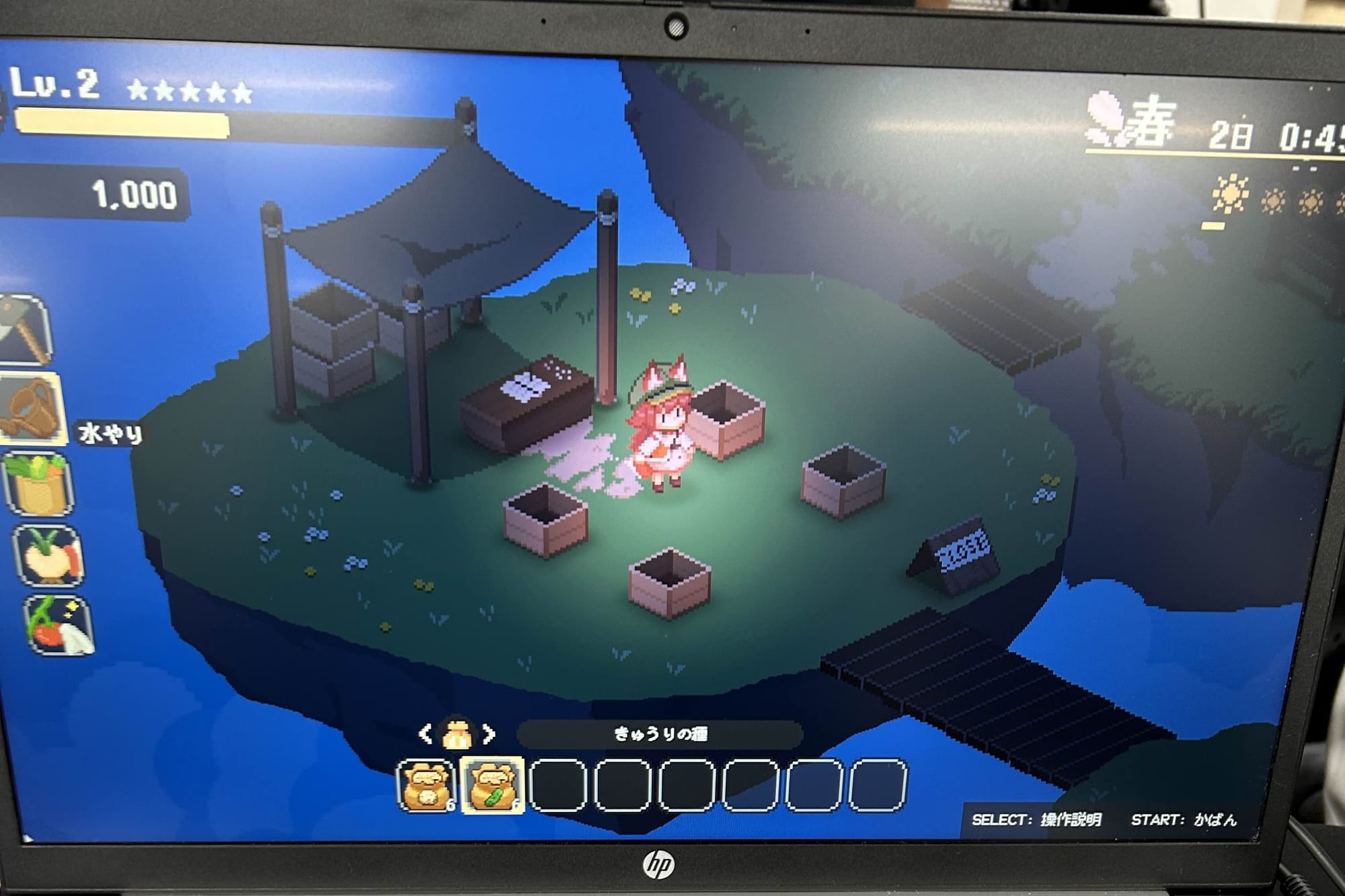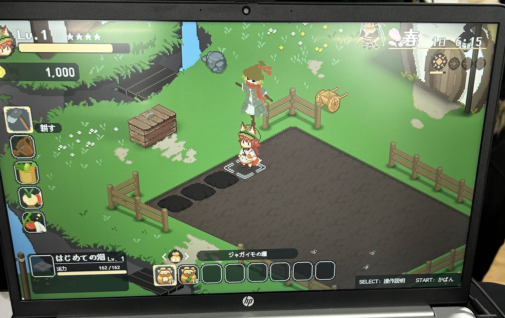今回の試遊版は、主に農作業の手触りをテンポよく確かめられる内容となっており、畑を耕し種を蒔くところから収穫・コンテストまでの流れをすべて体験できた。プレイヤーは十字キー入力でツールや動作を入れ替えながら、水やり・雑草抜きなどをこなし、作物の出来栄えを競うコンテストに向けて高品質な作物の生産を目指す。