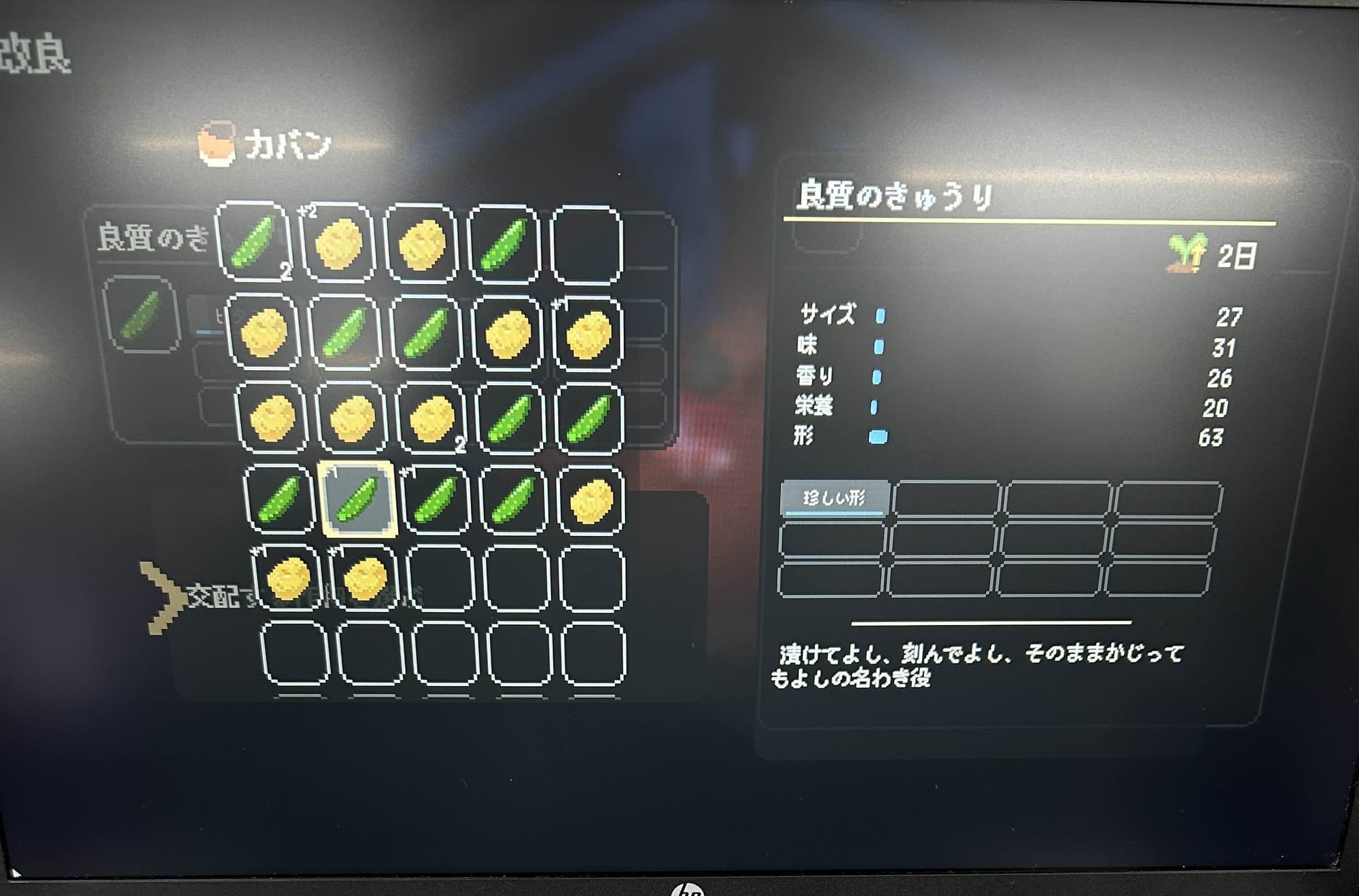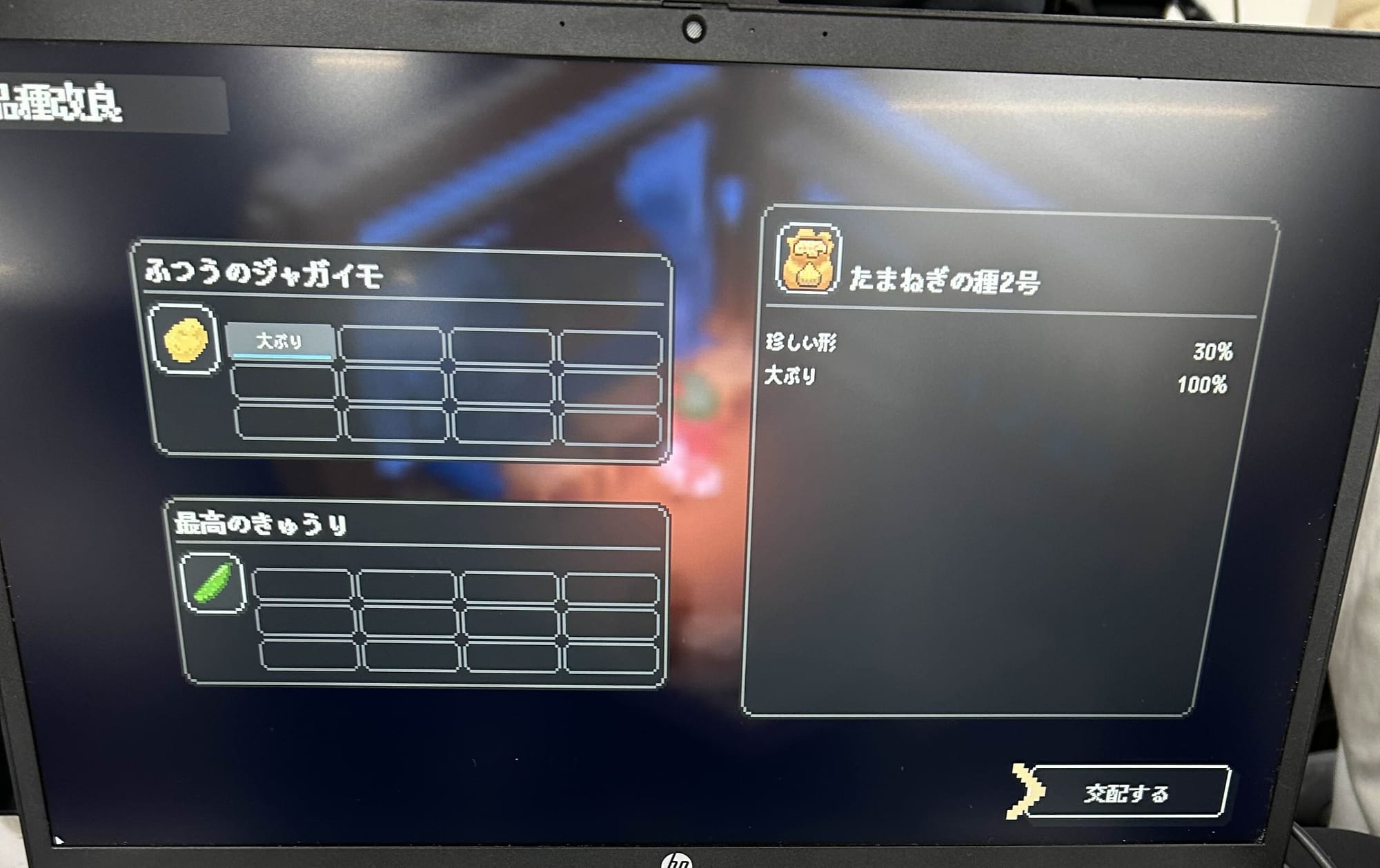 農場系ゲームでの品種改良は中盤以降の解放になることが多く、触れずにプレイを終えてしまうケースもあるので、初めての収穫物から取り組めるのは個人的に嬉しいポイントだ。改良に使用した作物は消費されるので、最高品質のお気に入りをコンテストに出すか種にするか、といった楽しい悩みどころでもある。プレイヤーごとの方針や個性があらわれる、シミュレーションらしい広まりを感じられた。